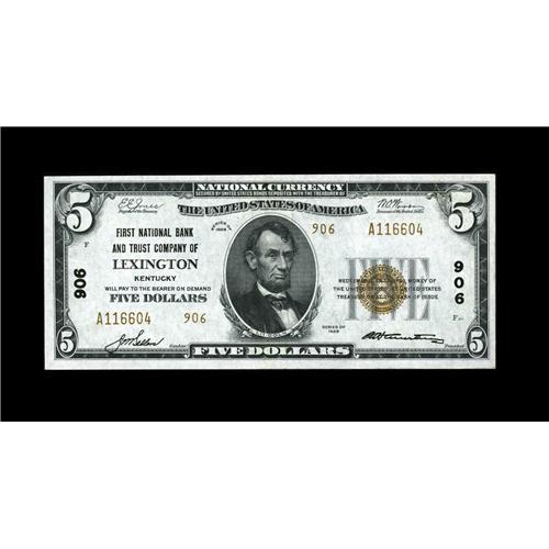 <B>Lexington, KY</B></I> - $5 1929 Ty. 2 <B>First NB & TC</B></I> Ch. # 906<BR>A <B>Gem Crisp Uncirculated</B></I> example of a note that belongs in any state collection of uncirculated 1929 Nationals. The collecting fraternity owes a debt of gratitude to the bank officer who set aside enough of these notes many years ago to help supply generations of collectors with such exceptional quality material. The paper quality is as nice as can be found on notes of this genre.