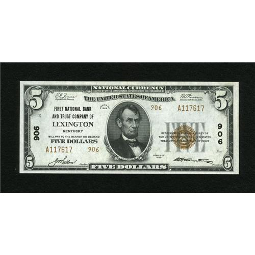 <B>Lexington, KY</B></I> - $5 1929 Ty. 2 <B>The First & City NB</B></I> Ch. # 906<BR>Wonderful embossing remains on the surface of this horde note. <B>Choice Crisp Uncirculated.</B></I><BR><BR><b>Shipping:</b> Coins & Currency (<a target="_blank" href="http://www.heritageauctions.com/common/shipping.php">view shipping information</a>)