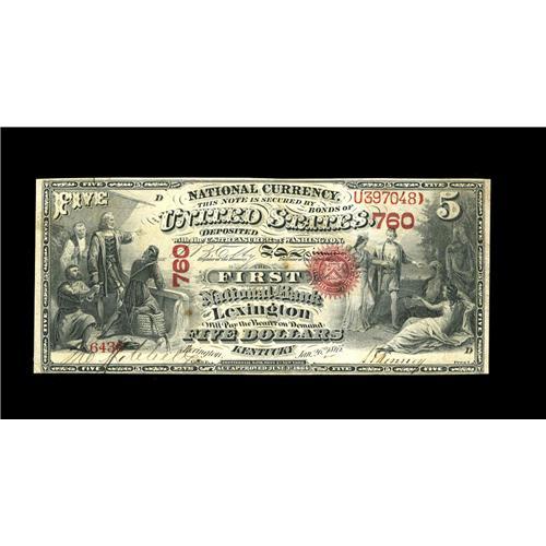 <B>Lexington, KY</B></I> - $5 Original Fr. 397 <B>The First NB</B></I> Ch. # 760<BR>Another very rare note, with this the only $5 Original Series example reported form any Lexington bank and one of just sixteen from all banks in Kentucky combined. <B>Very Fine+,</B></I> a colorful example fit for the finest of collections.