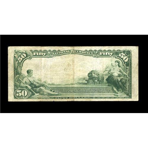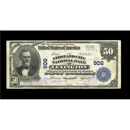 <B>Lexington, KY</B></I> - $50 1902 Plain Back Fr. 680 <B>The First & City NB</B></I> Ch. # 906<BR>This is not a terribly rare title, and high denominations are not unusually rare from here, but the Gengerke census of Friedberg numbers shows Fr. 680 to be prohibitively rare, with just a literal handful of examples reported to date. This may well be a sleeper note that turns out to be one of the bargains of the evening. <B>Very Fine.</B></I>
