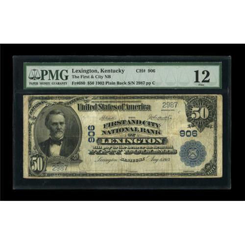 <B>Lexington, KY</B></I> - $50 1902 Plain Back Fr. 680 <B>The First & City NB</B></I> Ch. # 906<BR> High denomination Plain Backs are a bit tougher from here than Date Backs. <B>PMG Fine 12.</B></I><BR><BR><b>Shipping:</b> Coins & Currency (<a target="_blank" href="http://www.heritageauctions.com/common/shipping.php">view shipping information</a>)