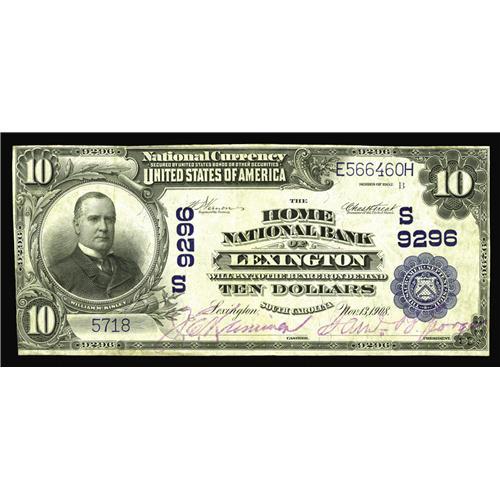 <B>Lexington, SC</B></I> - $10 1902 Plain Back Fr. 626 <B>The Home NB </B></I> Ch. # (S)9296<BR>A solid <B>Very Fine+</B></I> with considerable claim to the next higher grade. Our September, 2005 Long Beach auction included a Very Fine from here that suffered from a cut in top margin and was not the equal of this note from the standpoint of overall aesthetic appeal. It realized $920, a figure that this example should easily surpass.