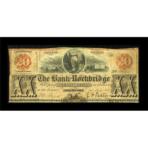 <B>Lexington, VA- The Bank of Rockbridge</B></I> $20 July 28, 1857 Jones BL15-30 G8a<BR> This is a truly rare item bearing the highest Jones & Littlefield rarity rating of 7H. <B>About Fine,</B></I> with a small stain at the bottom center, still a great note worthy of a four figure bid. <BR><BR><b>Shipping:</b> Coins & Currency (<a target="_blank" href="http://www.heritageauctions.com/common/shipping.php">view shipping information</a>)