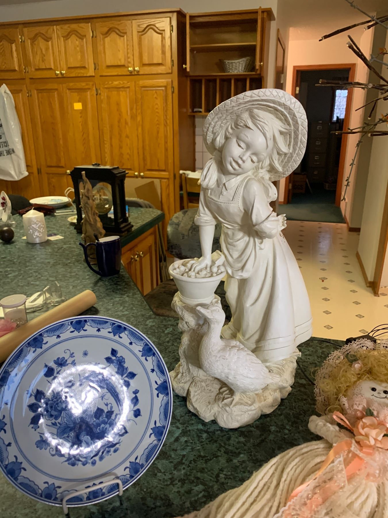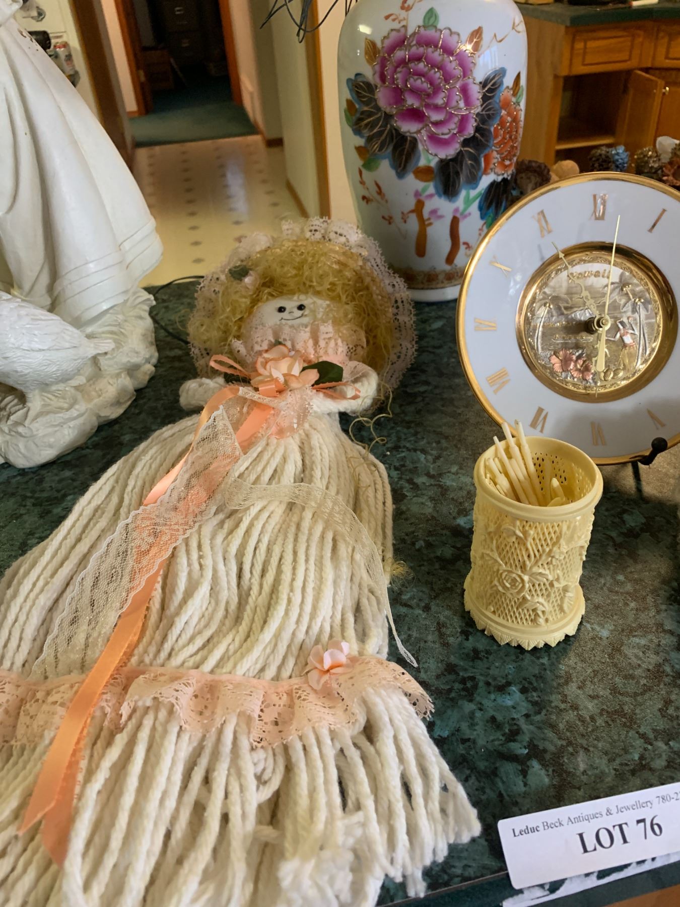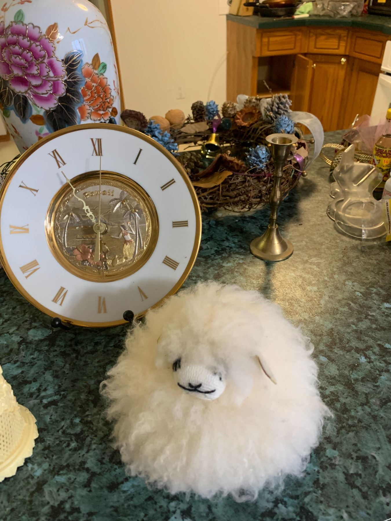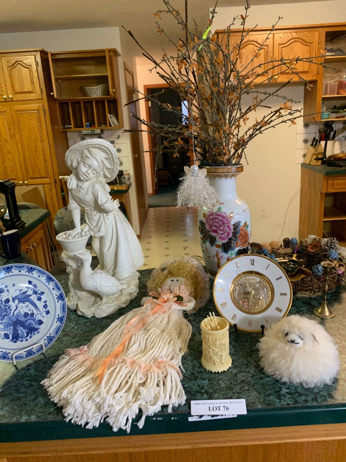 Lg Asian Vase with Light-up Foliage, Hawaii Wall Clock, String Doll, Brass Candle Holder, Wreath, Fluffy Lamb, De Porcelyne Fles Blue Plate