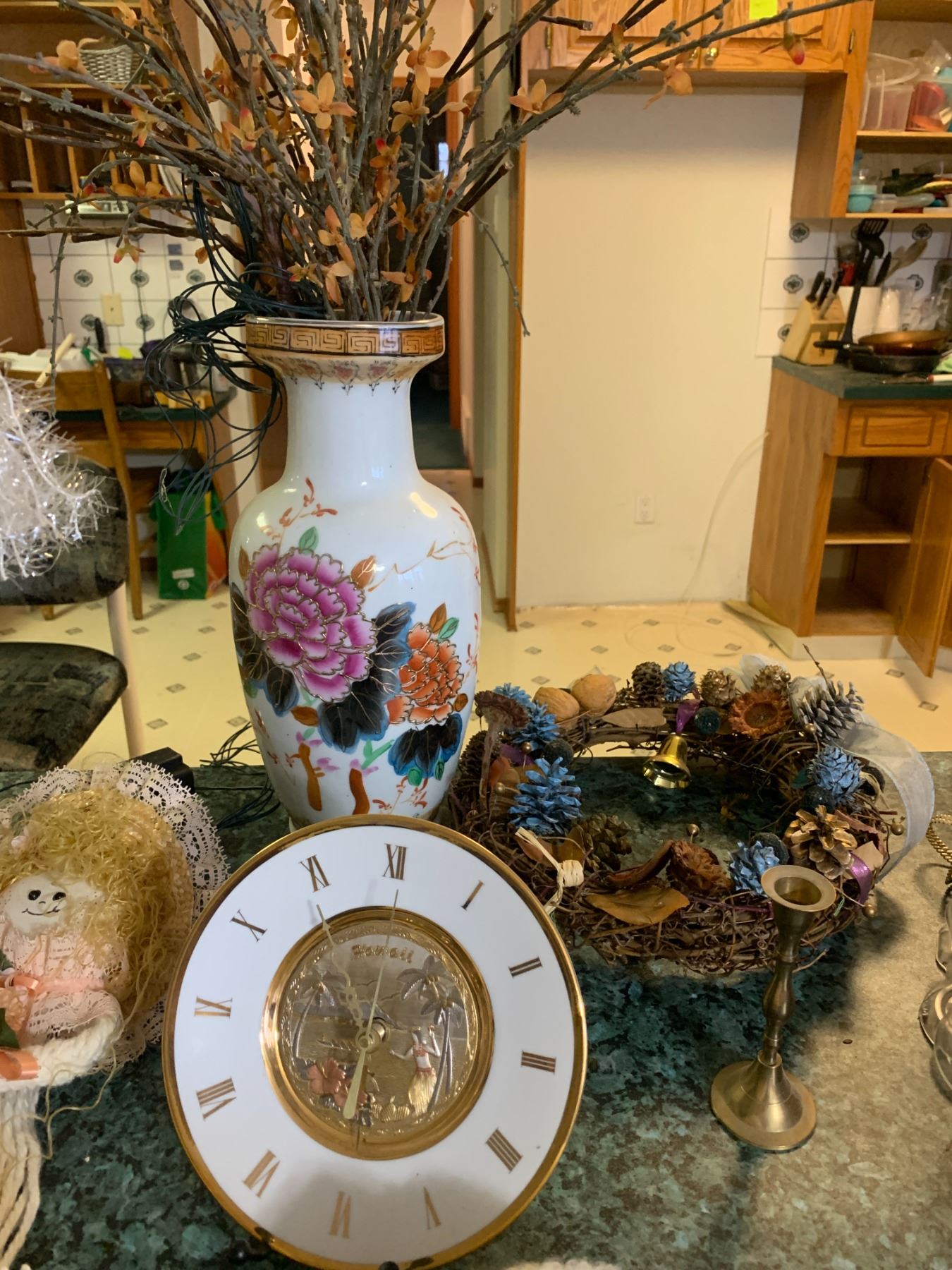 Lg Asian Vase with Light-up Foliage, Hawaii Wall Clock, String Doll, Brass Candle Holder, Wreath, Fl