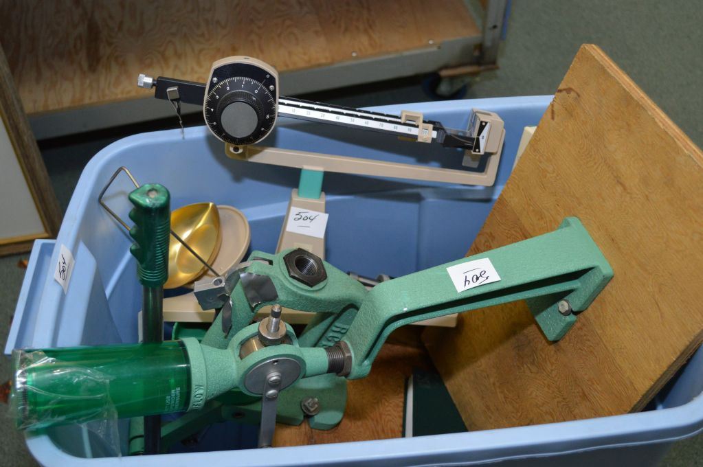Lg Blue Tub Lot : RCBS Press on board - w/ case trimmer - RCBS Uniflow Powder Measure on board - RCBS 304 Scale - Two reloading manuals