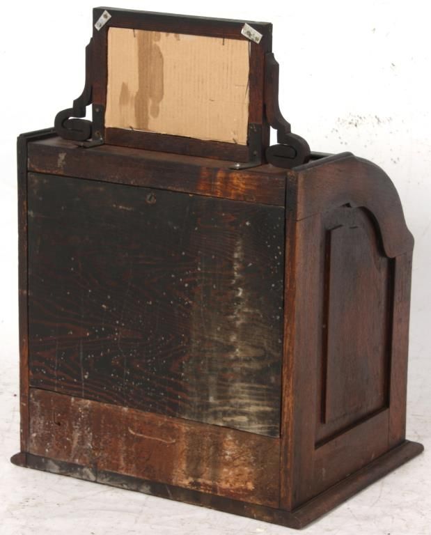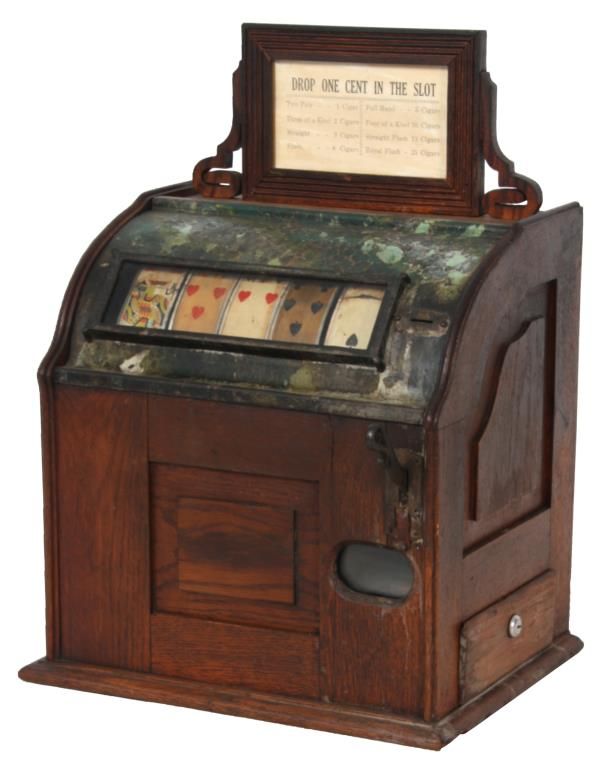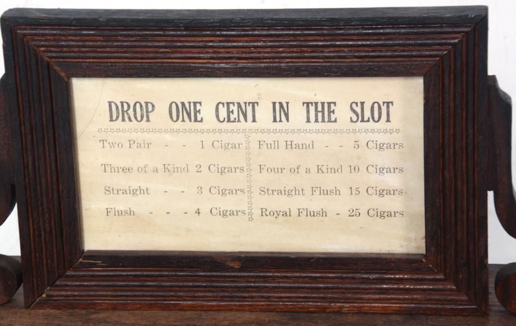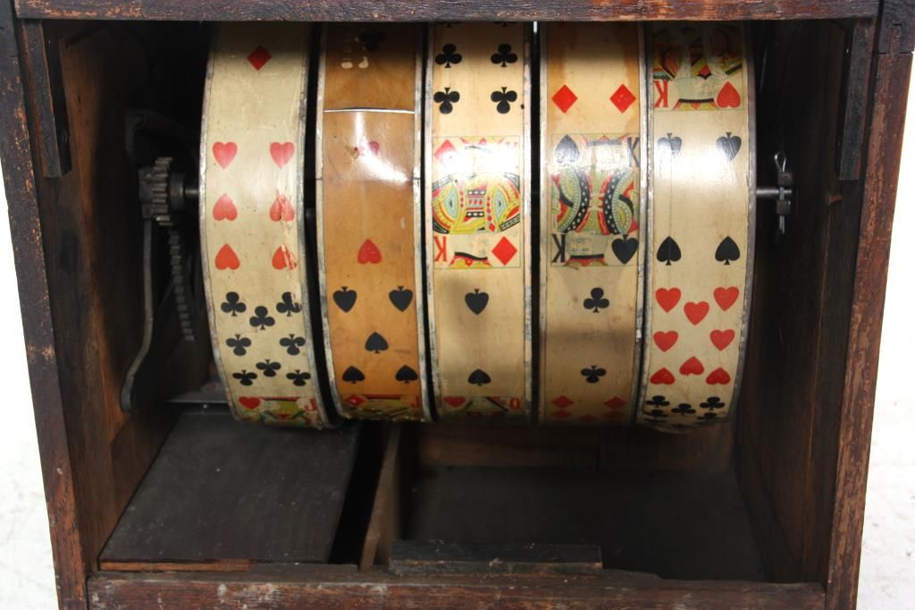 Lg. Card Game Trade Stimulator. Large oak case with faux marble painted iron front and lever; reel style slot machine with 5 large reels having playing card labels, 1 cent coin operated with coin slot to the right of the reels and oak display frame on the top with carved scrolled corbels and printed card describing the payout, in cigars, for winning hands. Case has a dirty original finish, in working condition. 25 in. high x 18 in. wide x 14 in. deep.