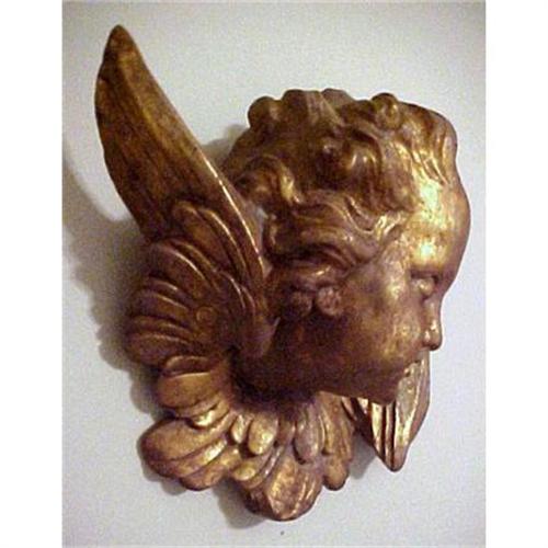 This stunning , large, cherub is carved wood and gesso and gold leaf. It is about 50 years old. The carving is beautifully done and very detailed. The color is a deep gold, patinated, and then natural grime (that doesn't sound good, but you probably know what I mean) from age. Very graceful and elegant any time of year. There is an old repair to a wing, barely visible from the front, slightly more noticeable from the back. The angel measures 14" across and 11" top to bottom.