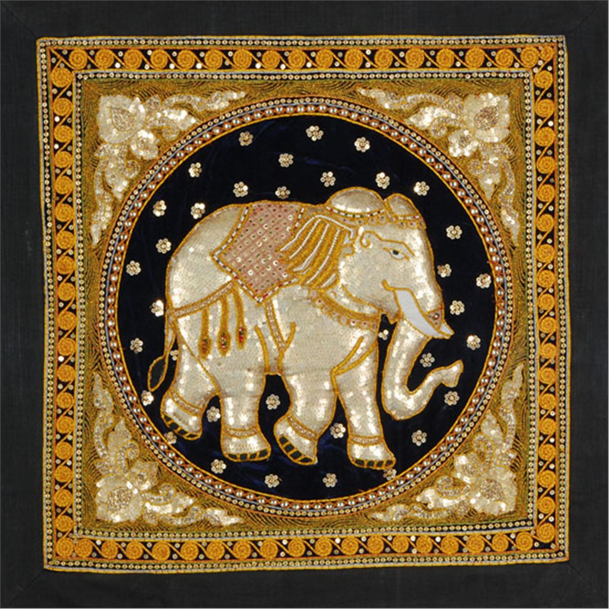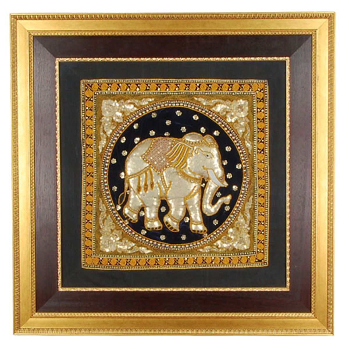 Handmade Burmese Wall Tapestry embroidered and sequined elephant pair. Many weeks of work go into each of these scarce pieces. Expensively framed; 37" sqaure. A truly beautiful investment.