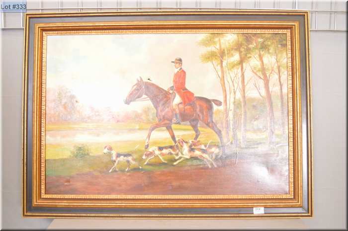 Lg Framed Painting " English Hunter on horse back with hounds" , signed by Artist, Note; damage above horse's head