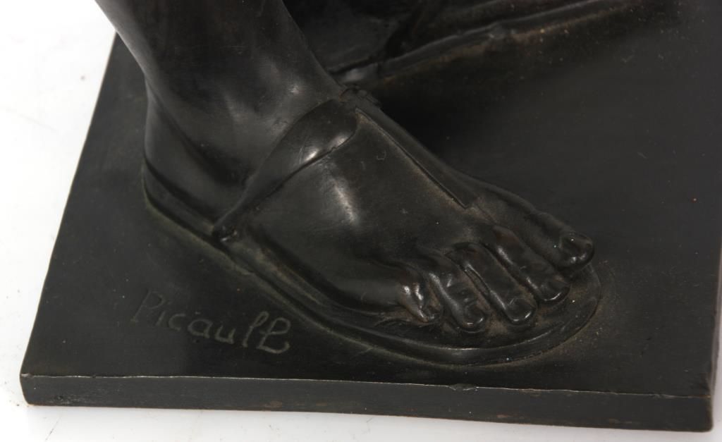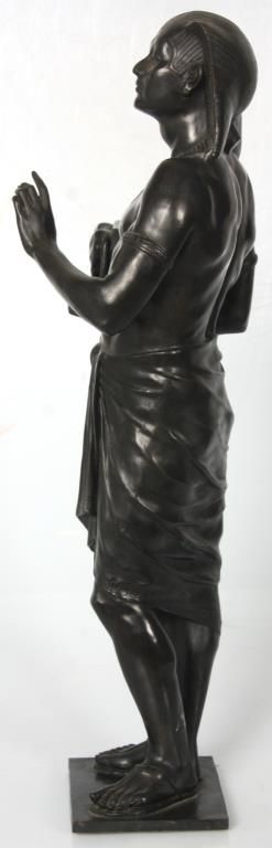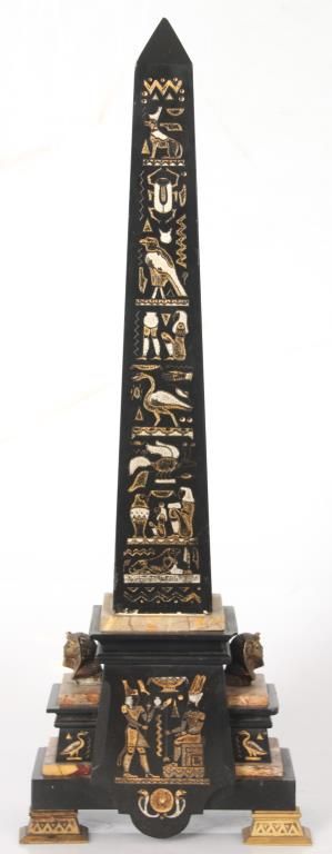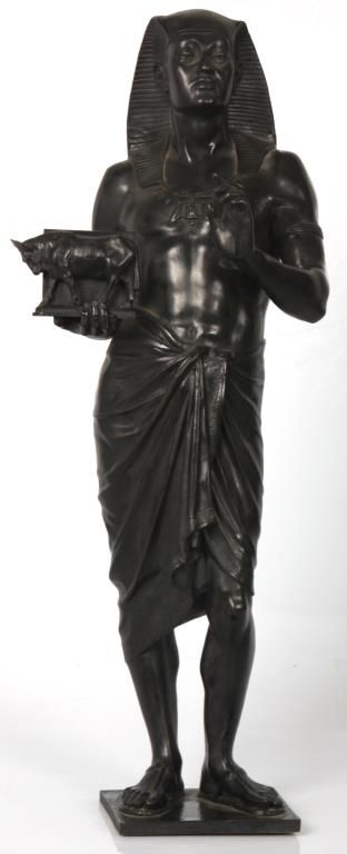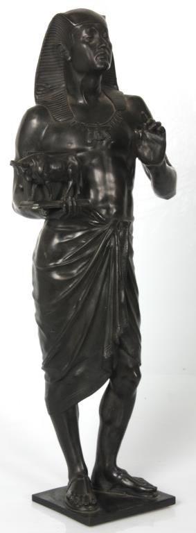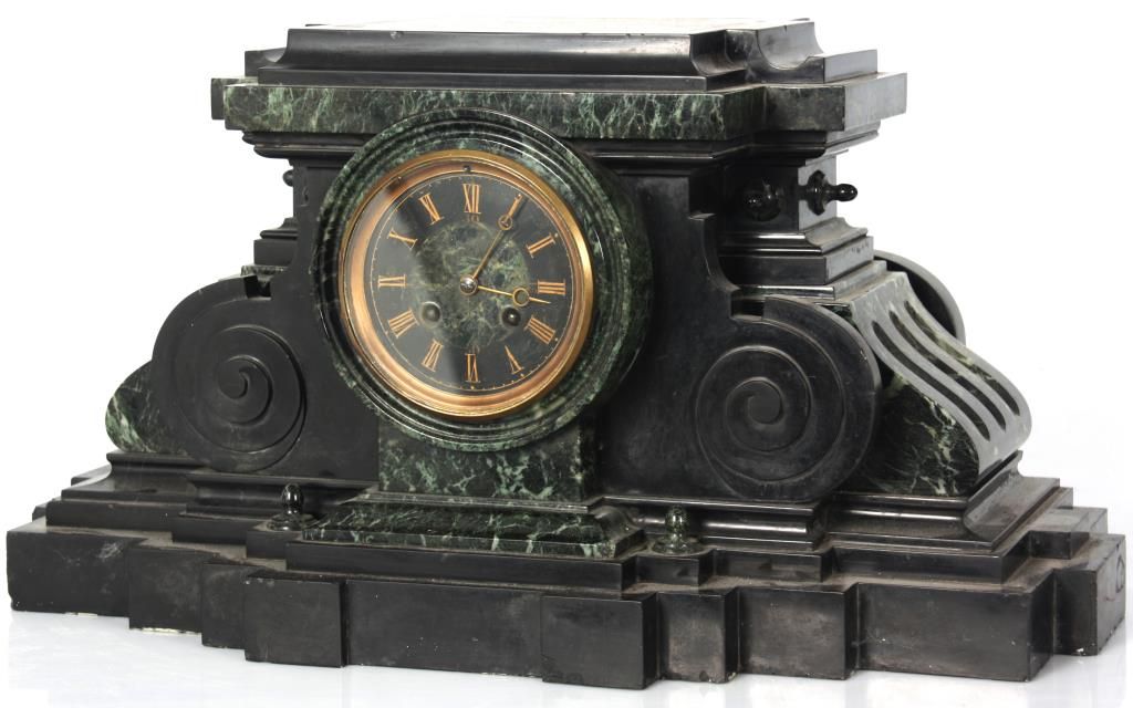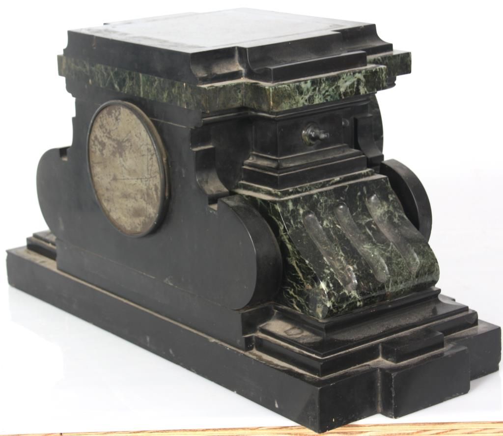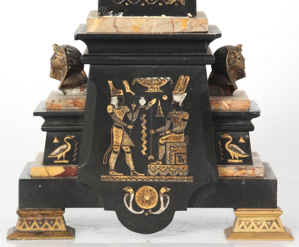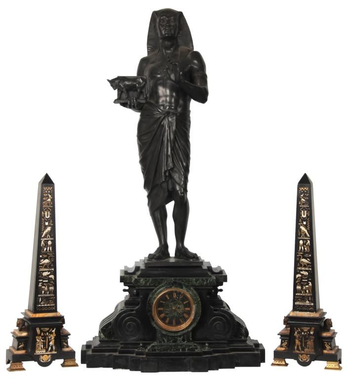 Lg. Marble & Bronze 3 Pc. Clock Set. Beautiful Egyptian revival 3 pc. clock set has black marble obelisk side pieces with hieroglyphic style incising on the front and bronze mounted feet; a large 2 tone green and black marble clock case with a large 28.5 in. standing bronze figure of an Egyptian figure holding a bull statue, the figure is signed Picault (Emile Louis Picault, 1833-1915, France), has a very good black patina. The clock base contains a 3.5 in. green and black marble dial with gilt incised Roman hour numerals and gilt open moon hands; typical, round, brass, French, spring driven movement striking on a steel bell and signed L’Marti & Cie. In good overall condition, front door glass is broken. Obelisks are 21 in. high. Clock is 39 in. high x 21 in. wide x 10 in. deep.