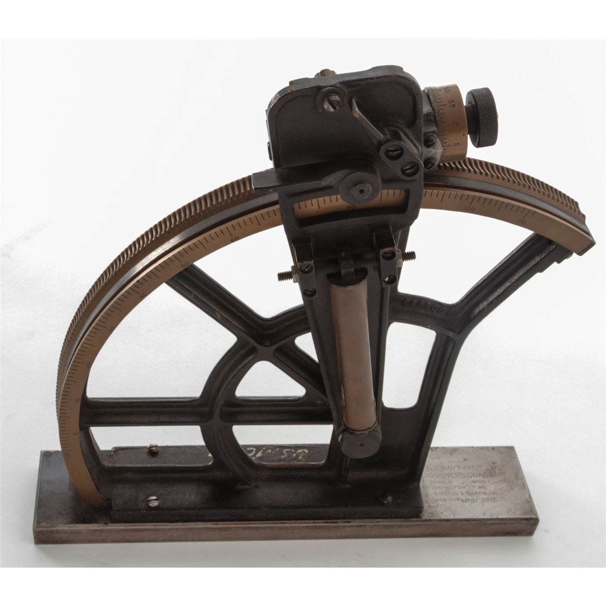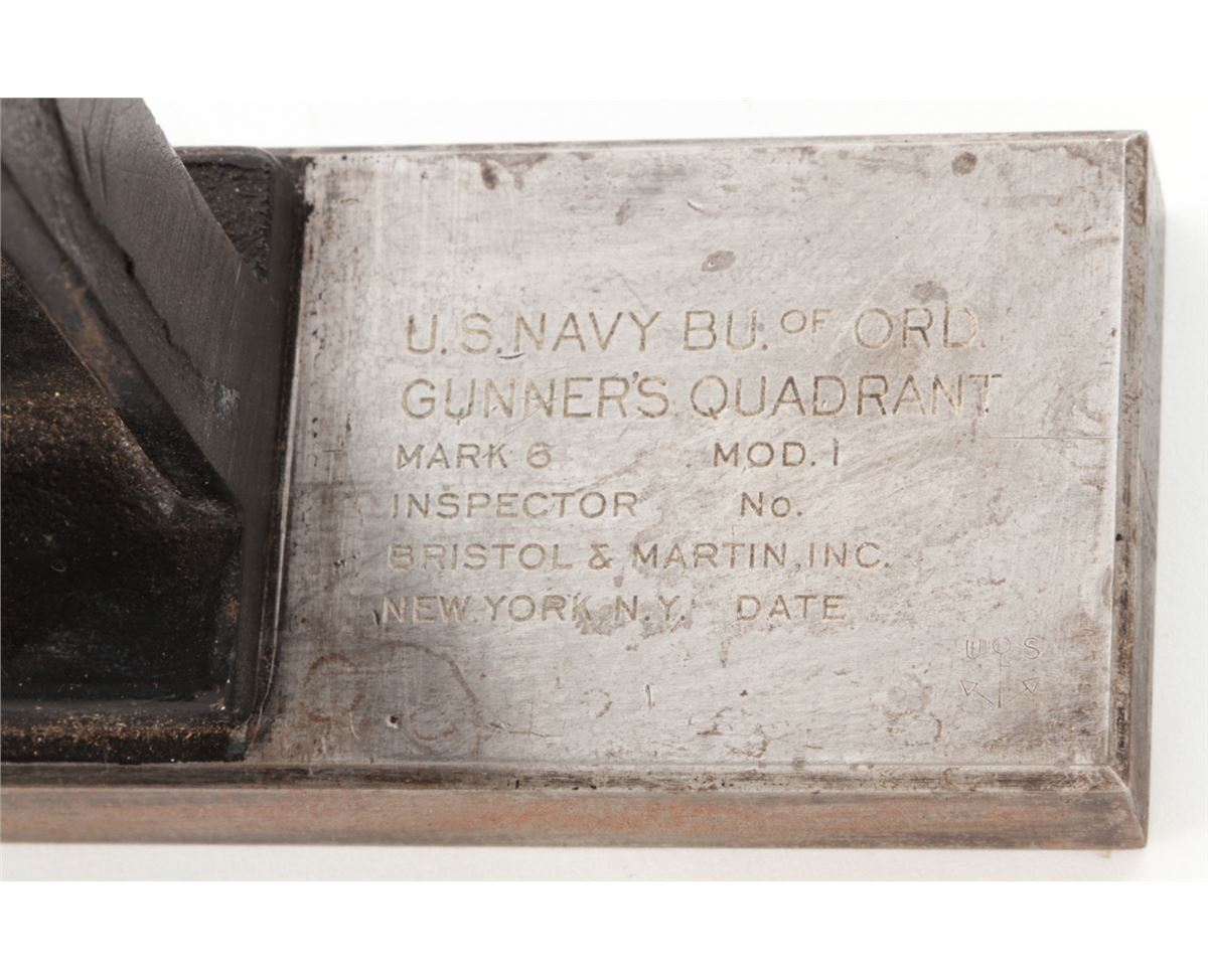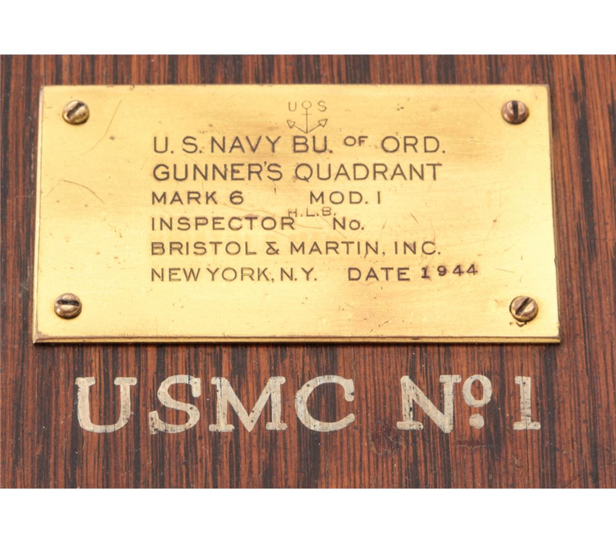 Large WWII Era (1944) U.S. Navy Bureau of Ordnance Gunner's Quadrant, Mark 6, Model 1, possibly used to adjust battleship guns. Mfg'd by Bristol & Martin, Inc., New York, NY. In original oak case. Also stamped ''USMC No. 1'', with 13'' base, weighing approx. 28 lbs. Condition is very good showing normal wear to case. Est.: $300-$500.
