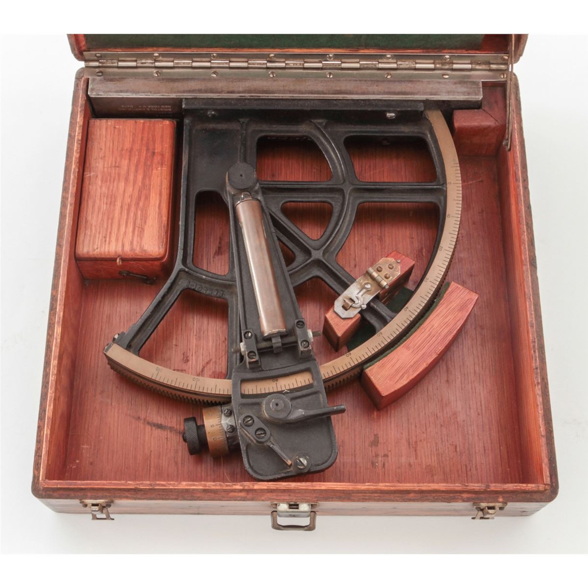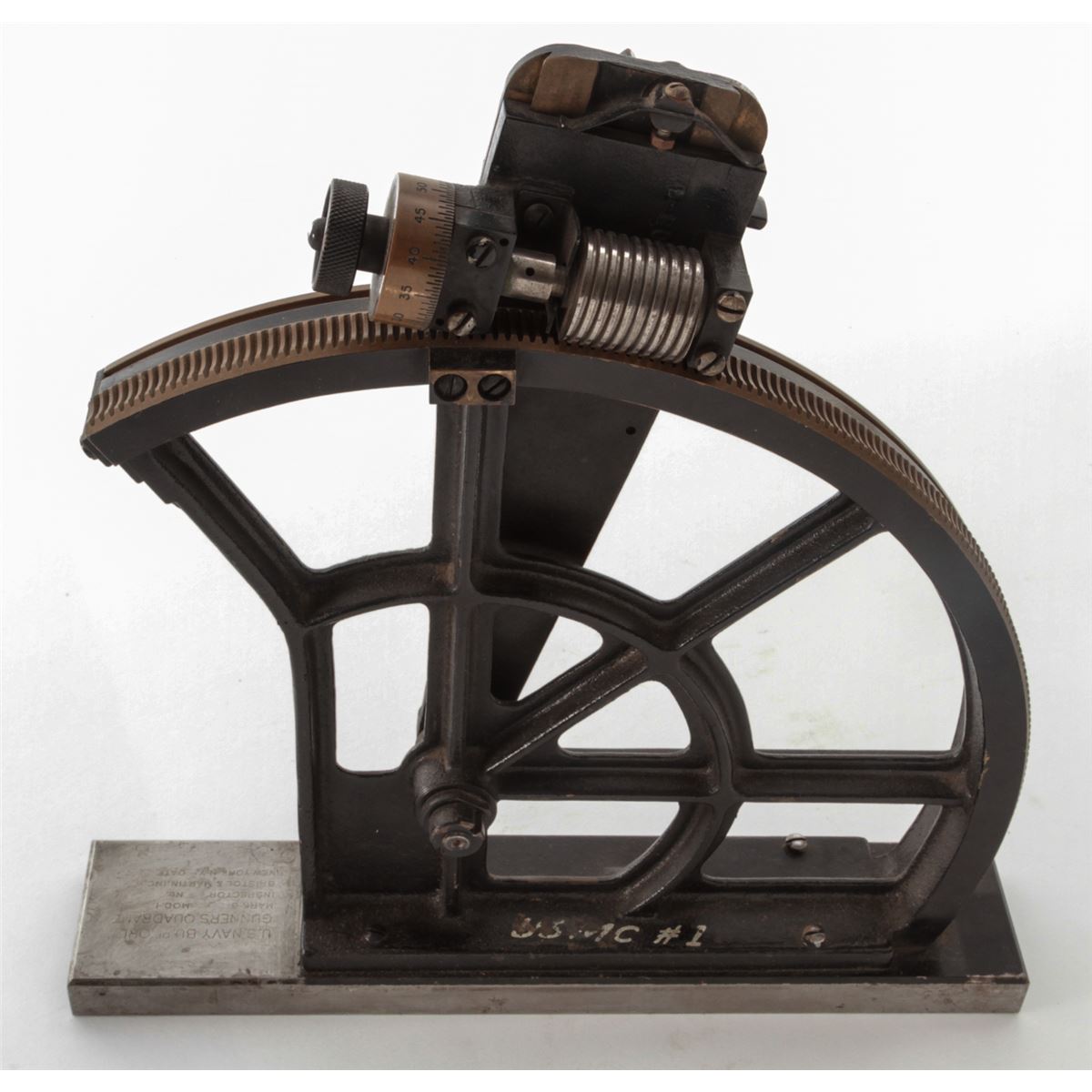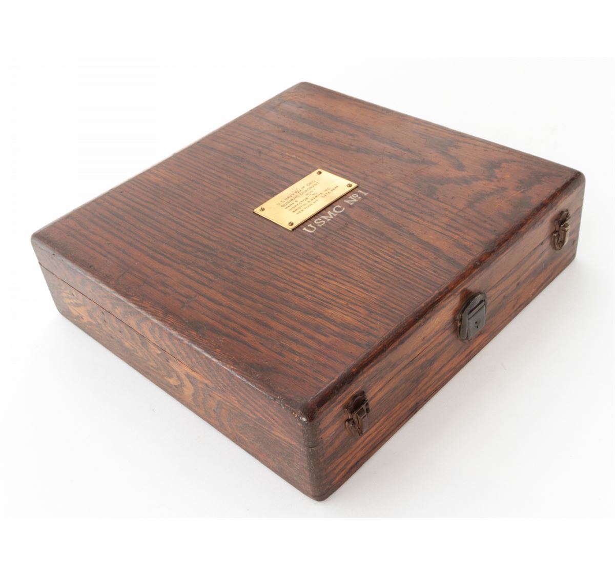 Large WWII Era (1944) U.S. Navy Bureau of Ordnance Gunner's Quadrant, Mark 6, Model 1, possibly used to adjust battleship guns. Mfg'd by Bristol & Martin, Inc., New York, NY. In original oak case. Also stamped ''USMC No. 1'', with 13'' base, weighing approx. 28 lbs. Condition is very good showing normal wear to case. Est.: $300-$500.