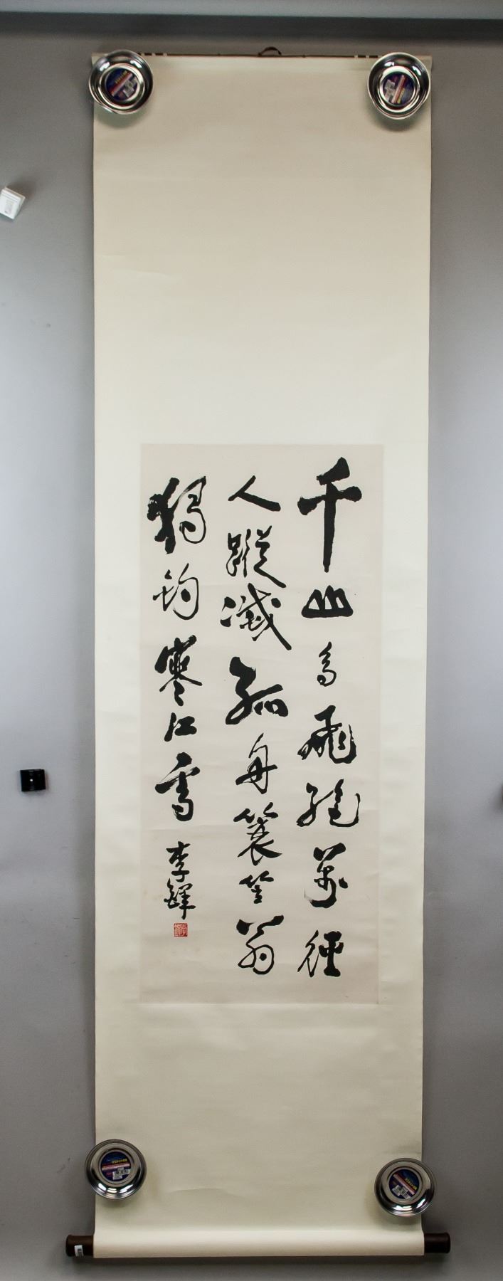 Ink on paper, hanging scroll. Featuring Chinese calligraphy. Signed Li Duo (1930-Present, Chinese), inscribed with 1 artist seal. 96 x 42 cm