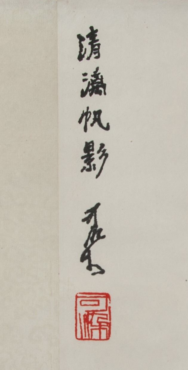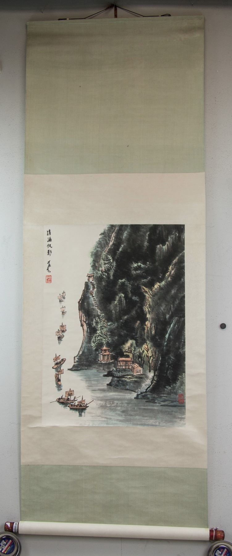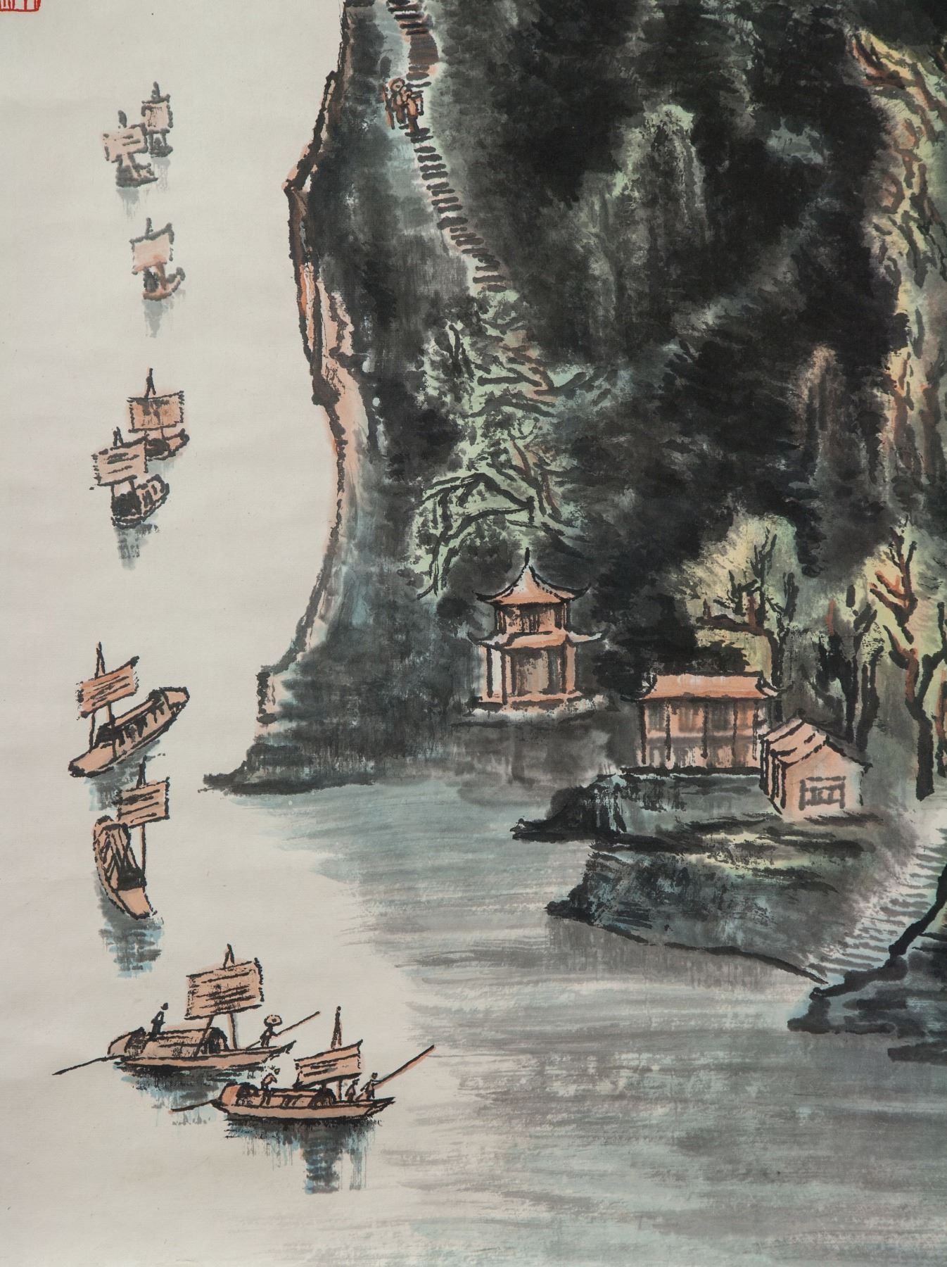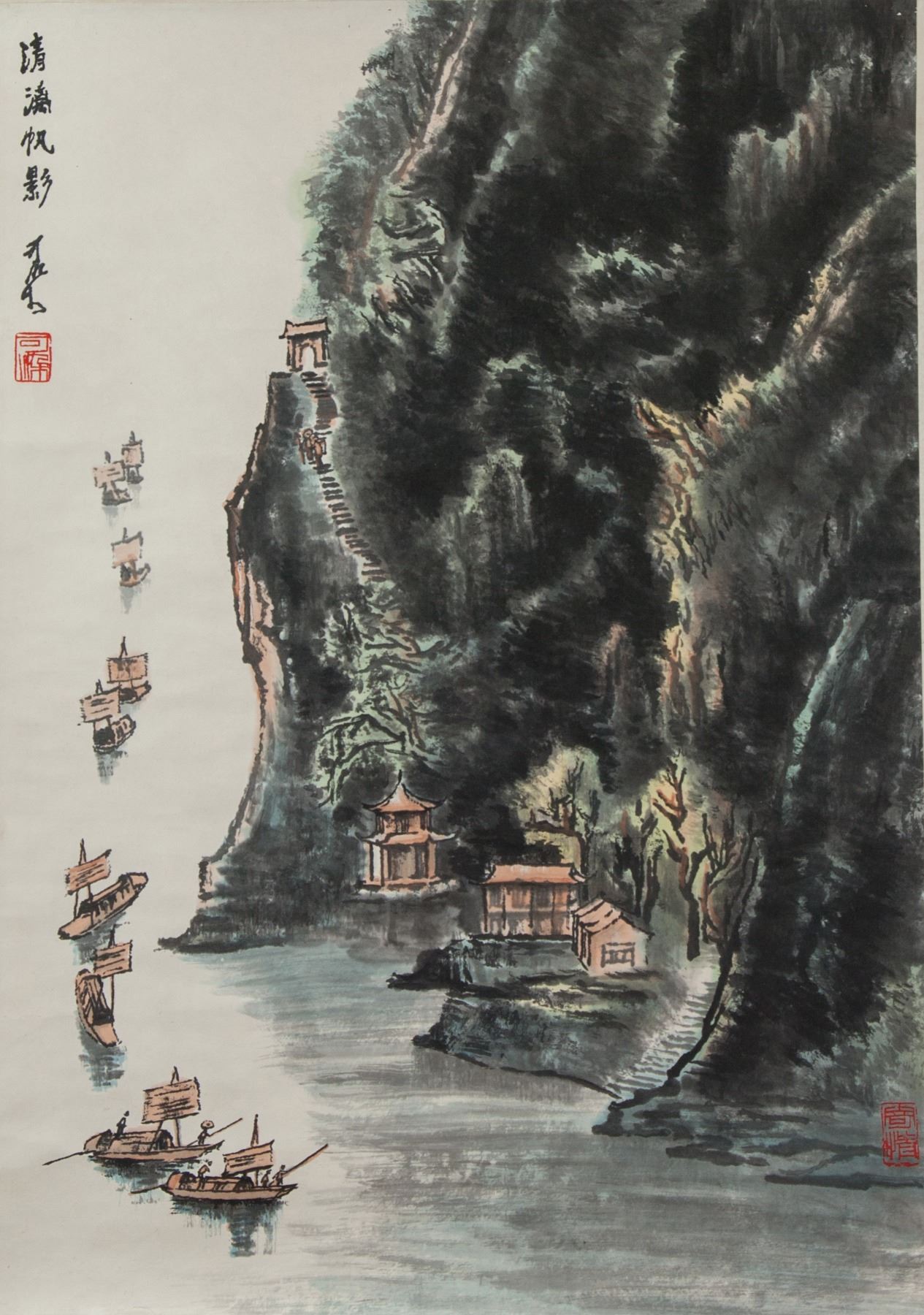 Mountainous landscape and river with boats; Chinese ink and watercolour on paper; hanging scroll; signed Li Keran (1907-1989); inscribed with 2 artist seals; 68 cm x 48 cm