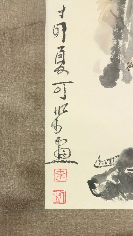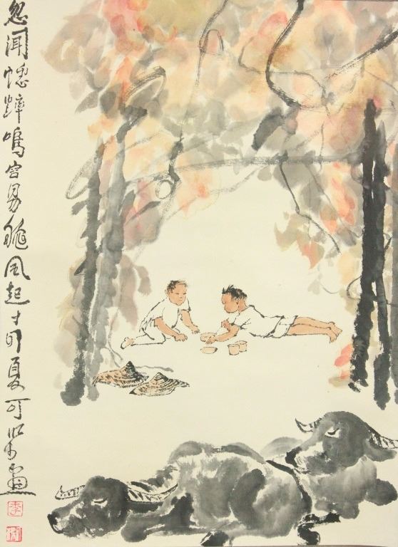 Two boys playing cricket fight while tending cows; Chinese ink and watercolour on paper; hanging scroll; signed Li Keran (1907-1989); inscribed with 2 artist seals; 66 cm × 49 cm