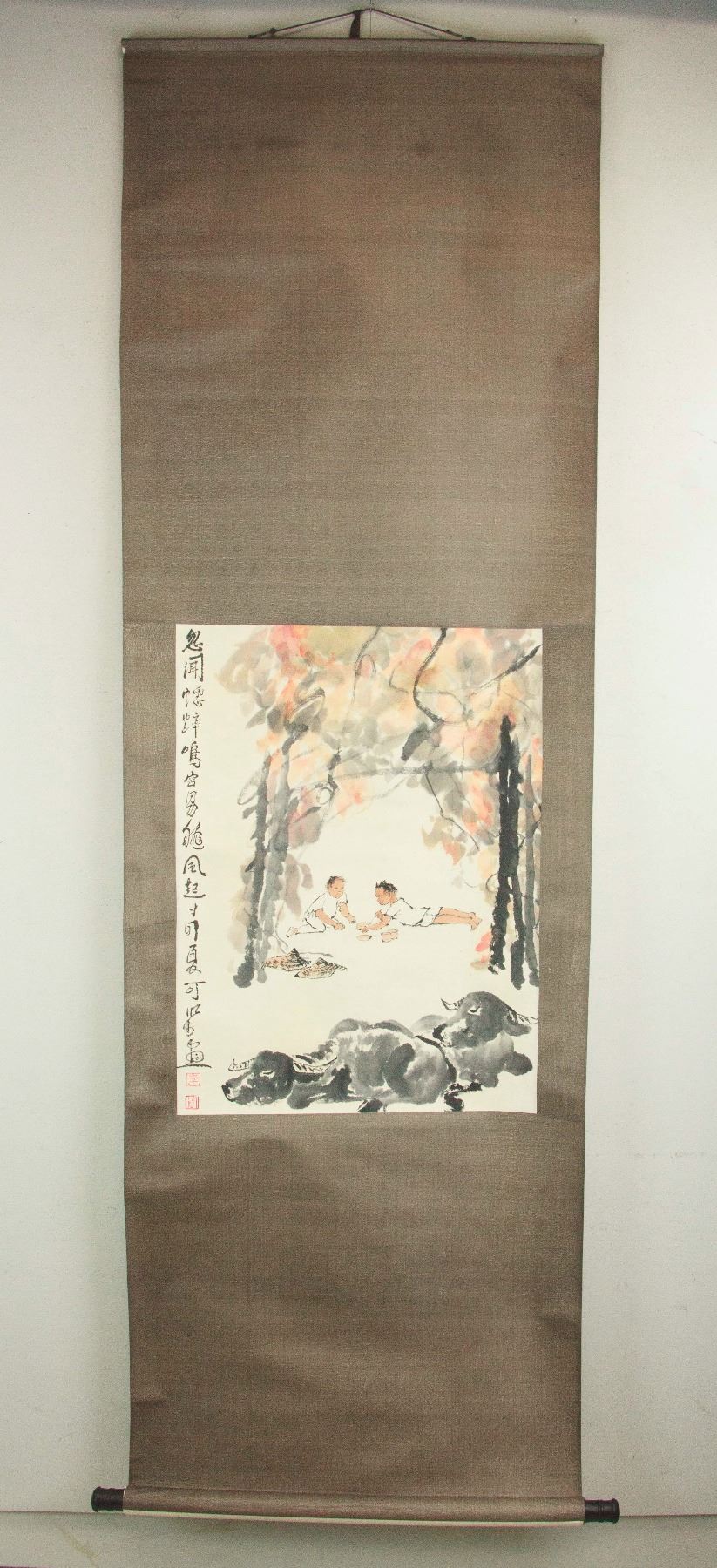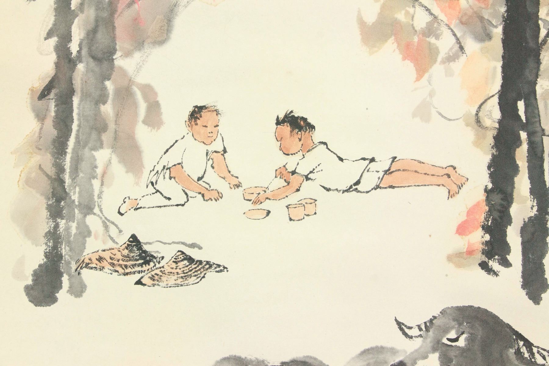 Two boys playing cricket fight while tending cows; Chinese ink and watercolour on paper; hanging scroll; signed Li Keran (1907-1989); inscribed with 2 artist seals; 66 cm × 49 cm
