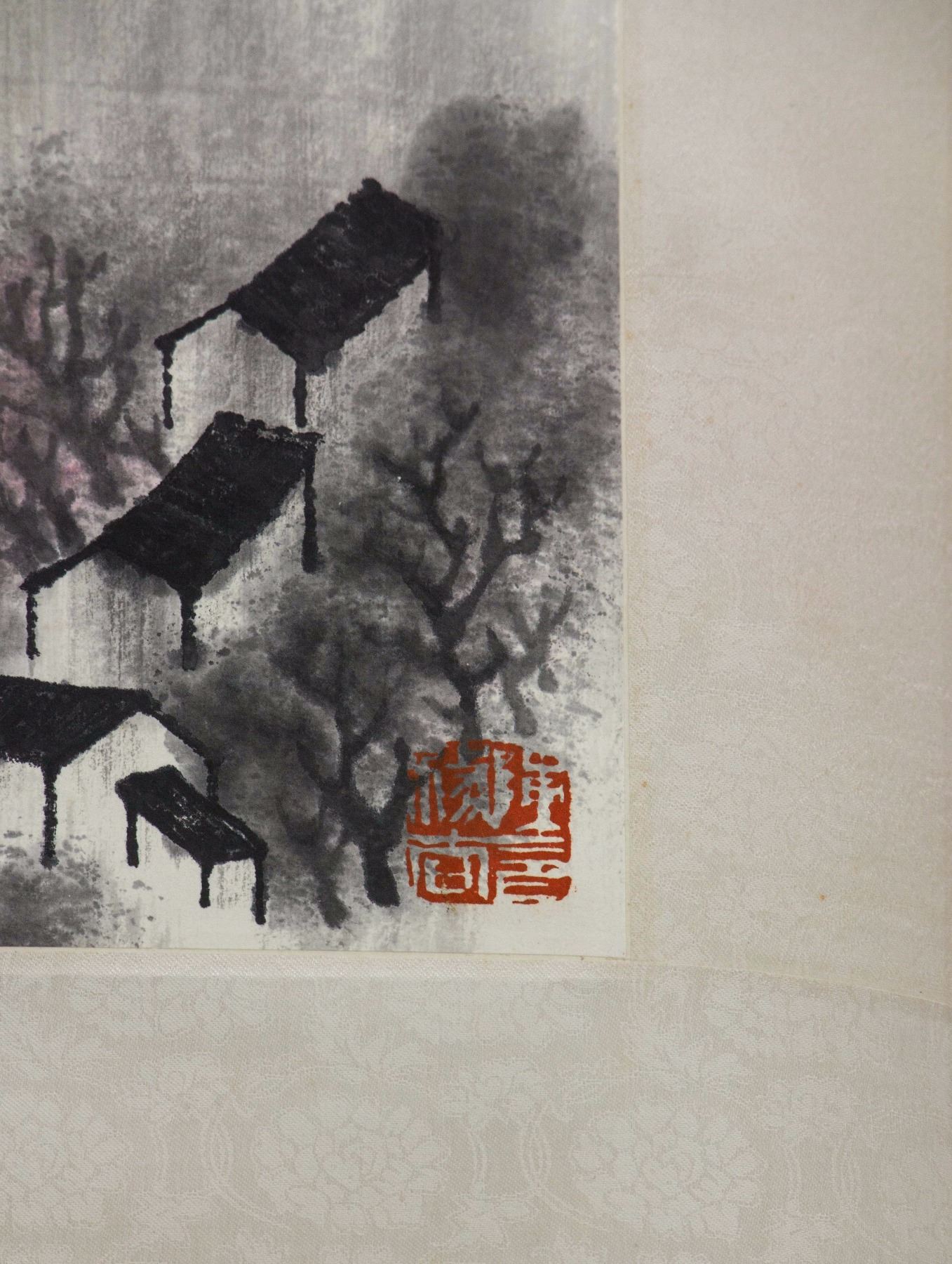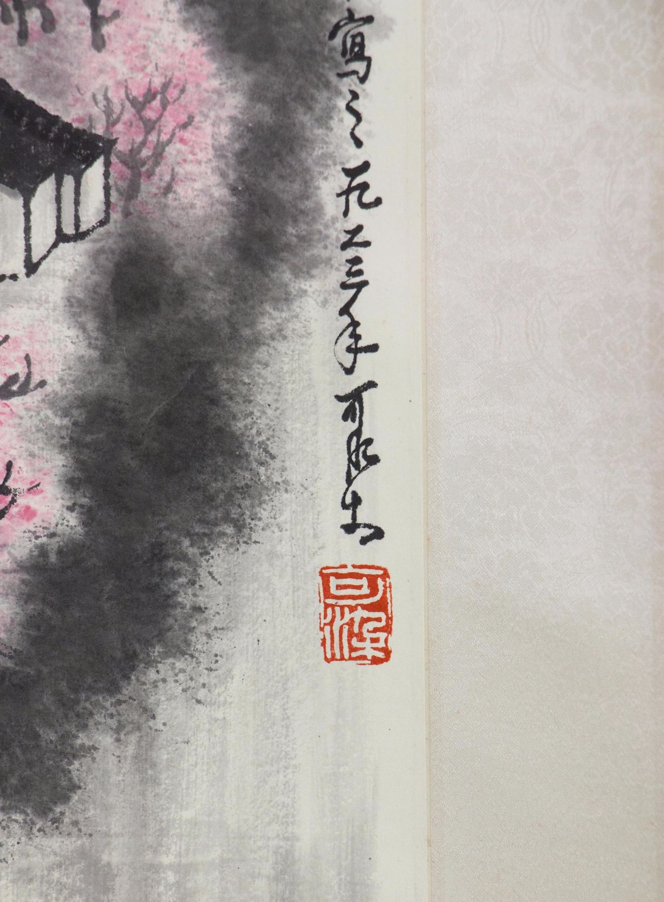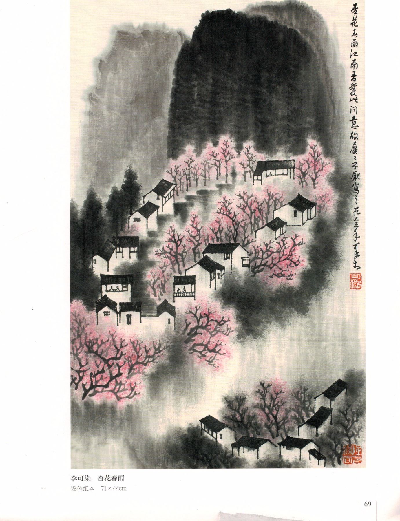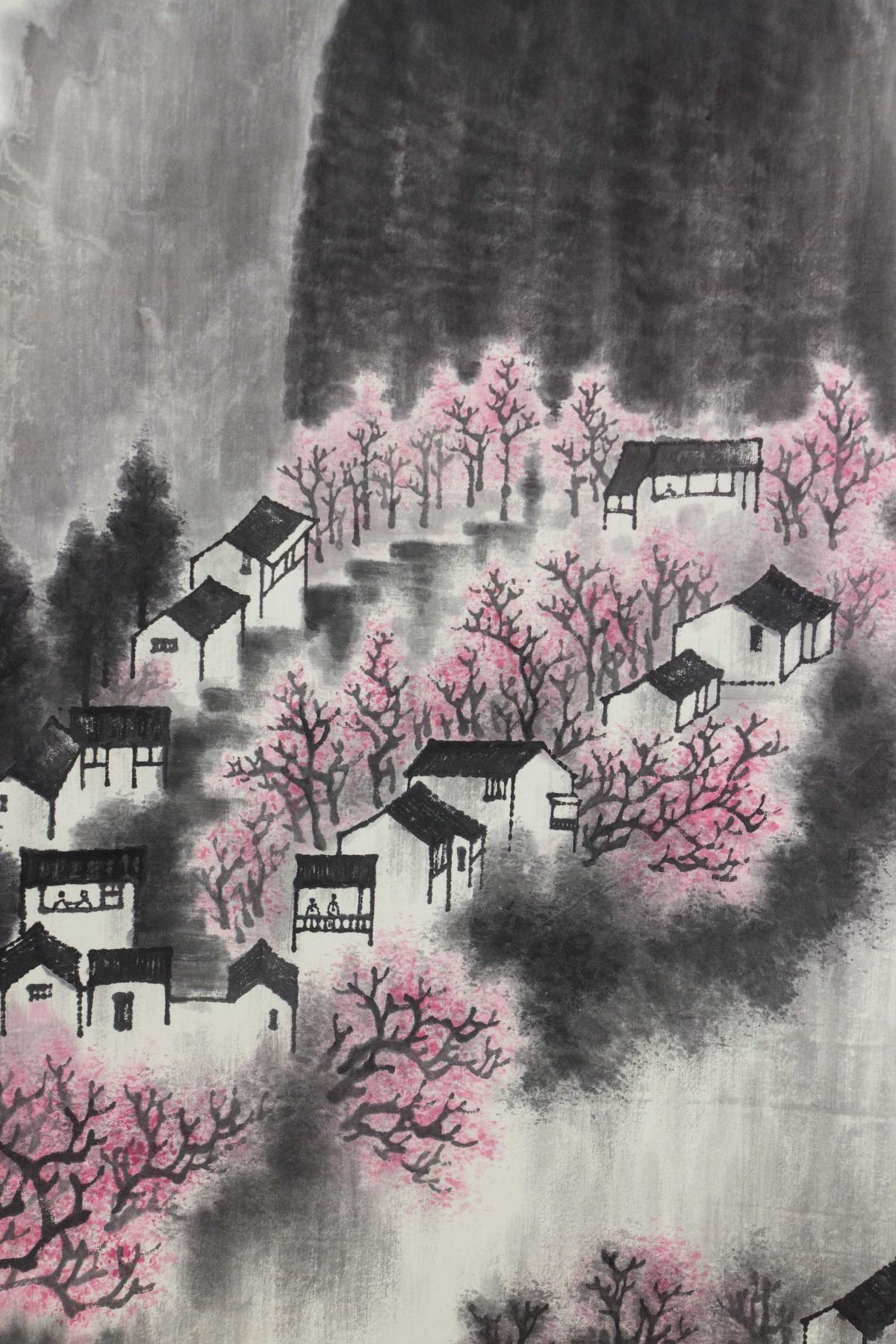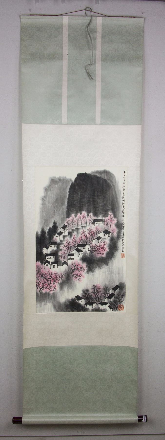 Mountainous landscape with village and peach trees; Chinese ink and watercolour on paper; hanging scroll; signed Li Keran (1907-1989); inscribed with 2 artist seals; published on Page 69 of catalogue highlighting famous Chinese fine art paintings (ISBN 978-7-8310-7536-3); 71 cm x 44 cm