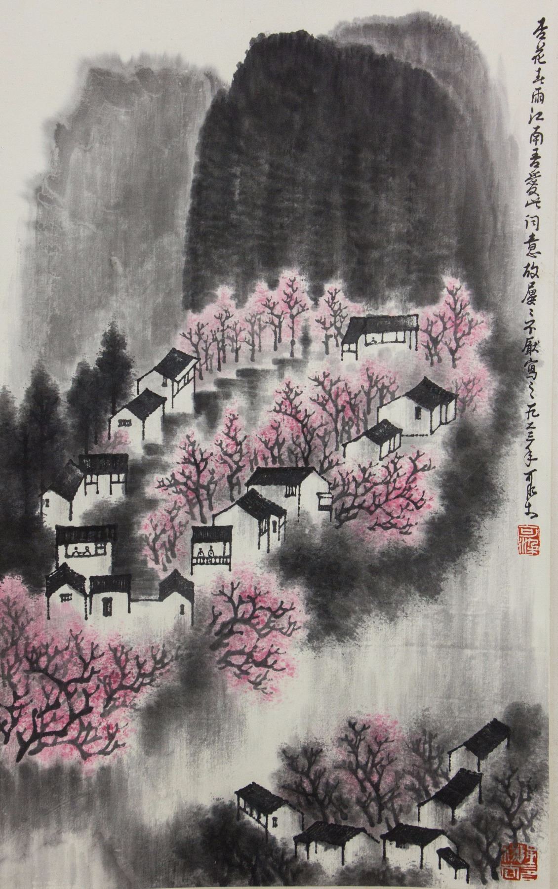 Mountainous landscape with village and peach trees; Chinese ink and watercolour on paper; hanging scroll; signed Li Keran (1907-1989); inscribed with 2 artist seals; published on Page 69 of catalogue highlighting famous Chinese fine art paintings (ISBN 978-7-8310-7536-3); 71 cm x 44 cm