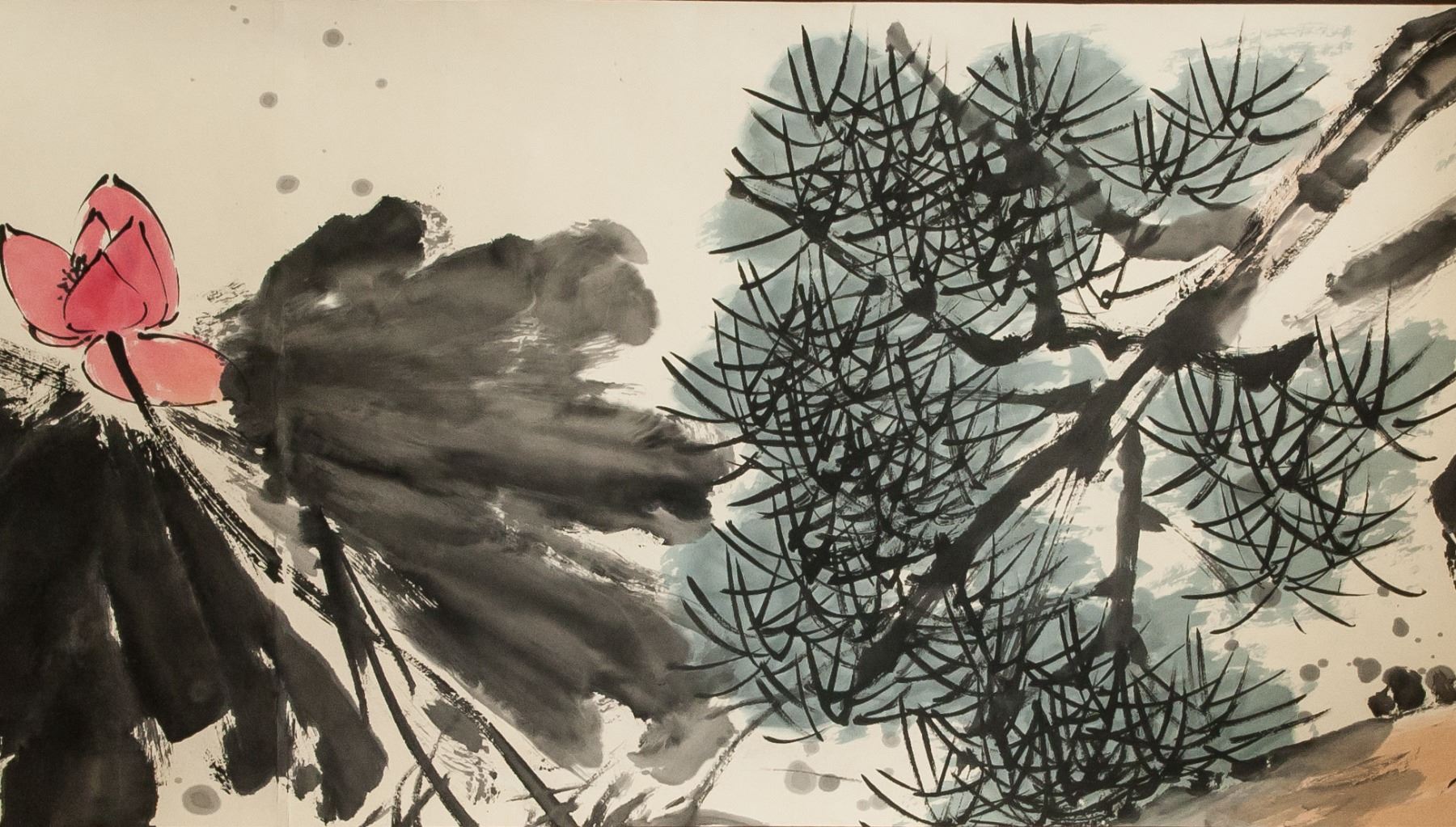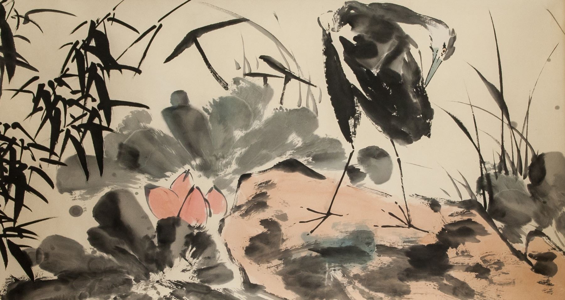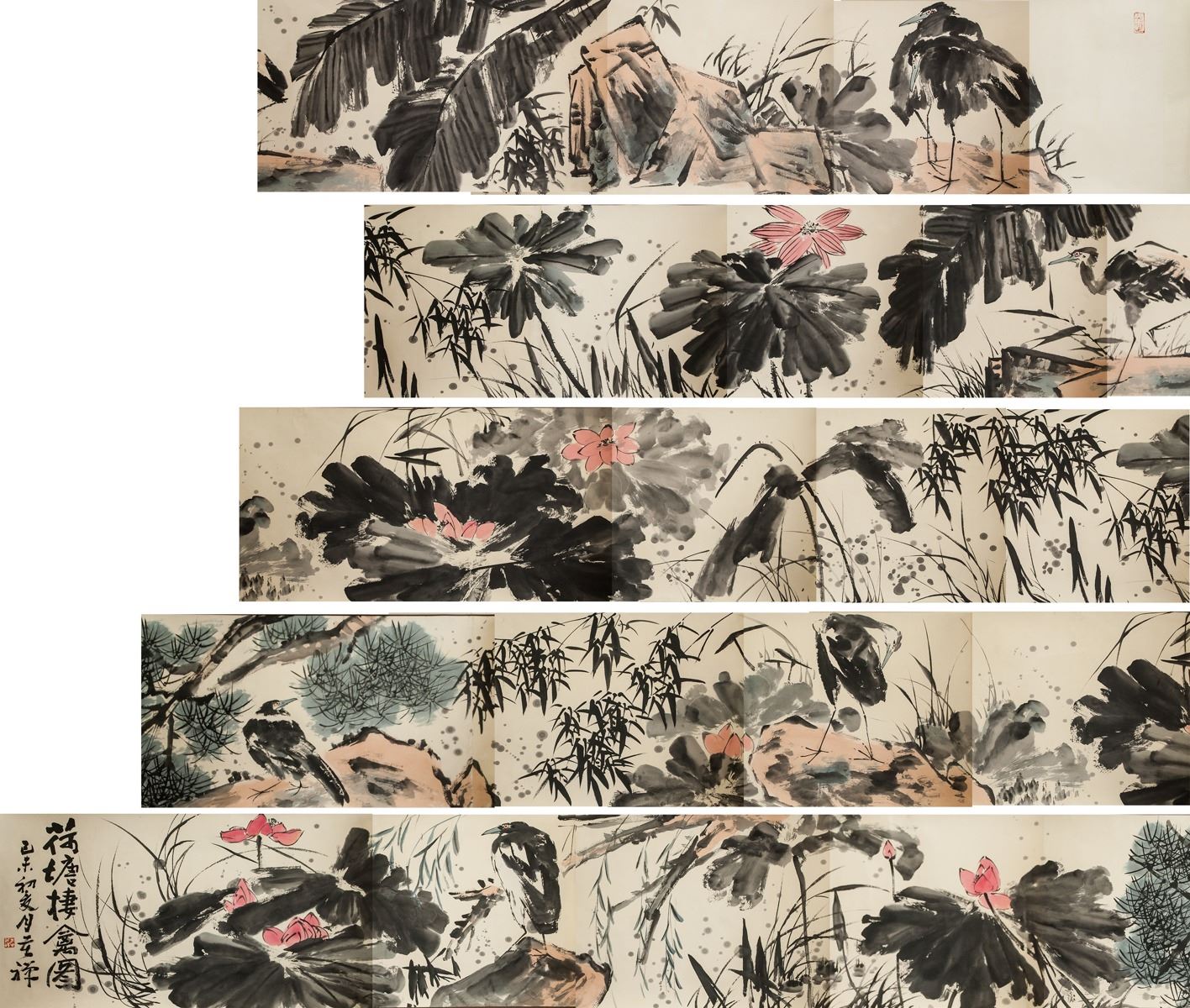 Watercolor and ink on paper, long hand scroll. Featuring lotus pond and birds. Signed Li Kuchan 1898-1983 Chinese, inscribed with 2 artist seals. 46 x 1067 cm.