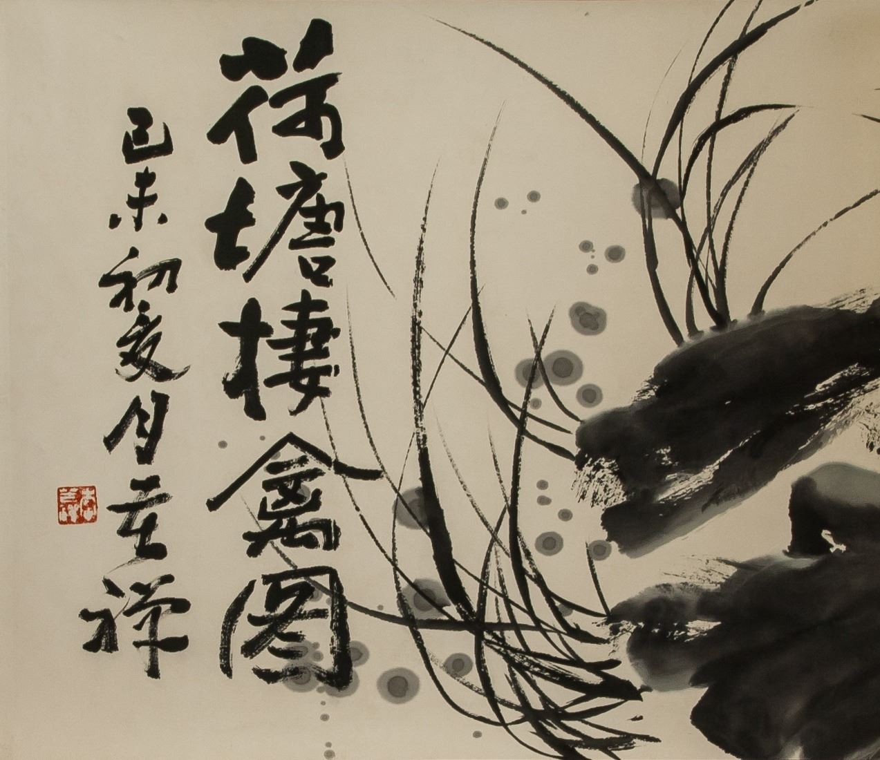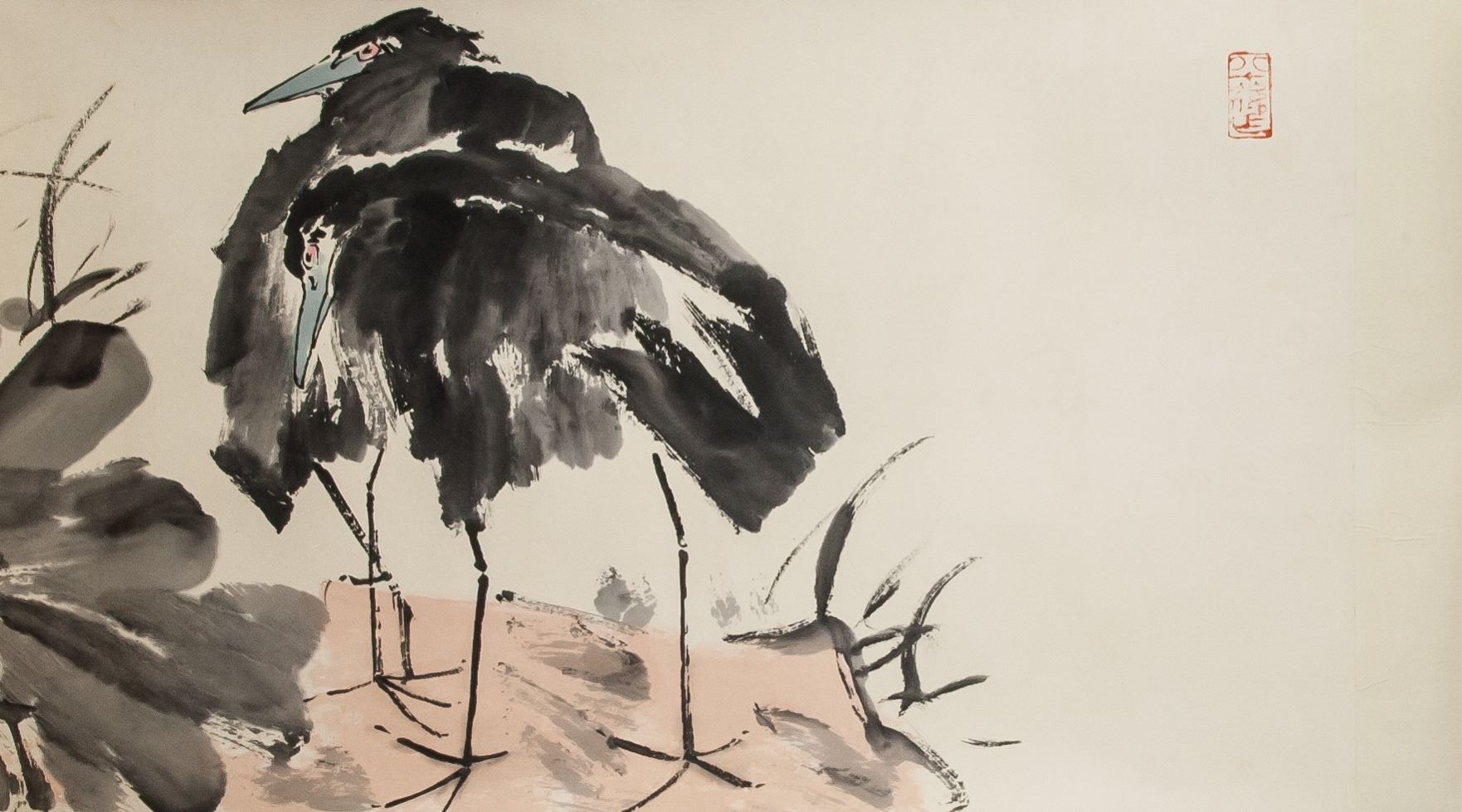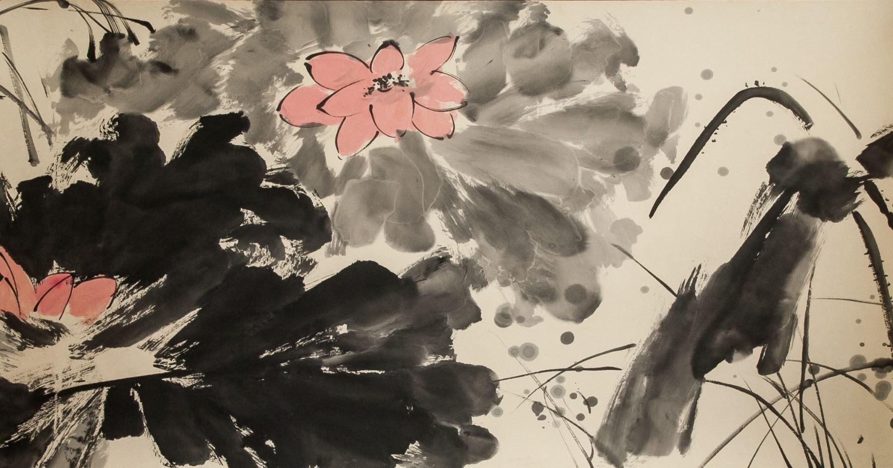 Watercolor and ink on paper, long hand scroll. Featuring lotus pond and birds. Signed Li Kuchan 1898-1983 Chinese, inscribed with 2 artist seals. 46 x 1067 cm.