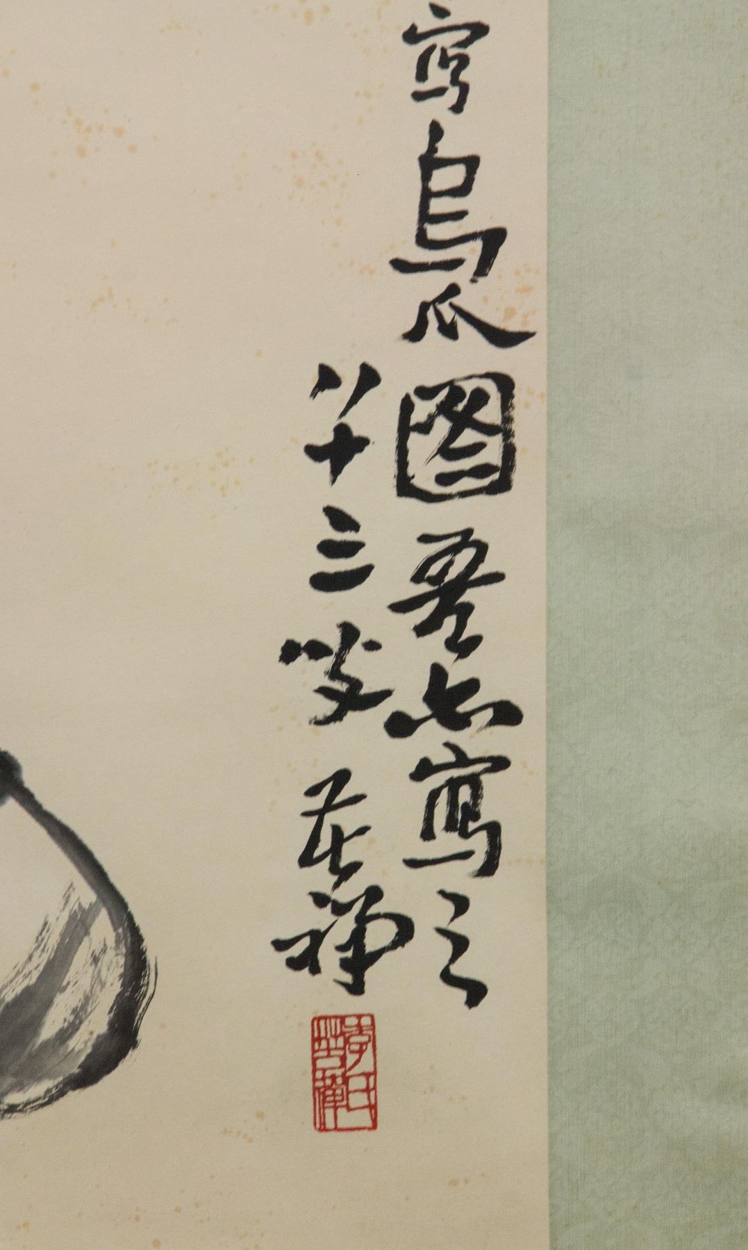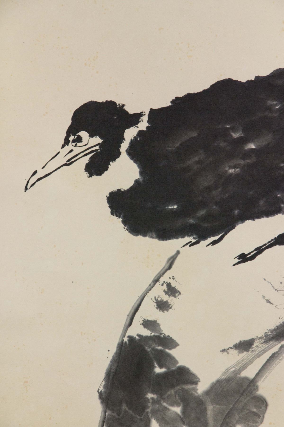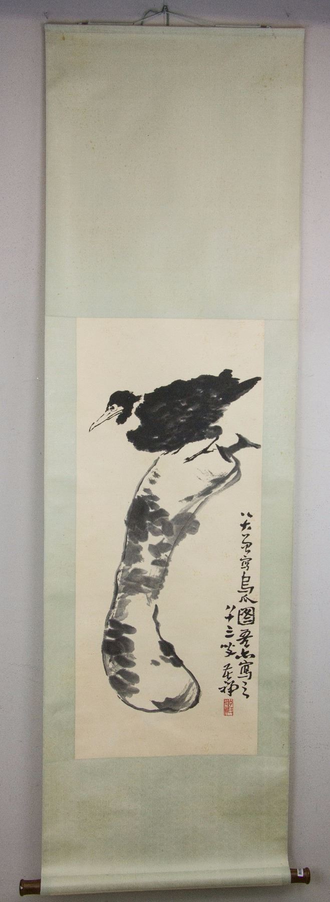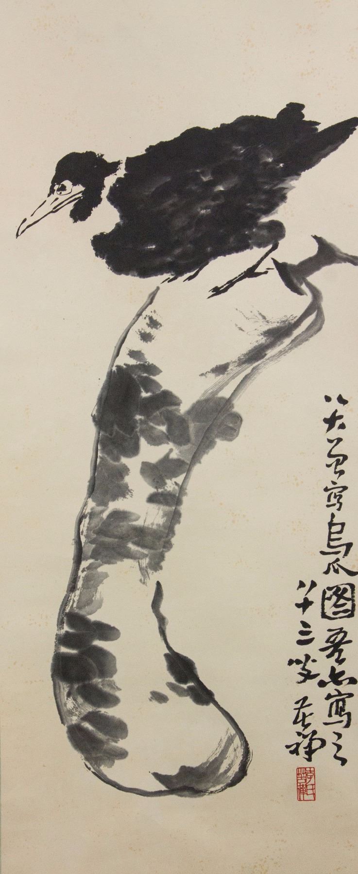 Drawing of crow standing on trunk; Chinese ink on paper; hanging scroll; signed Li Kuchan (1899-1983); inscribed with 1 artist seal; 100 cm x 42 cm