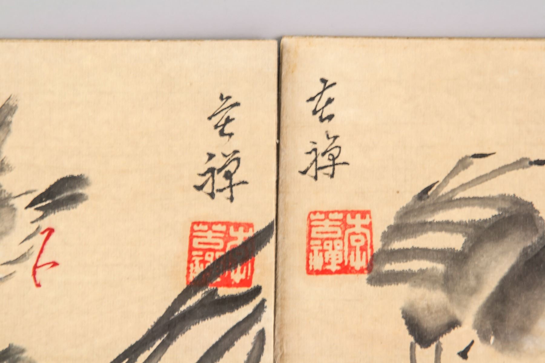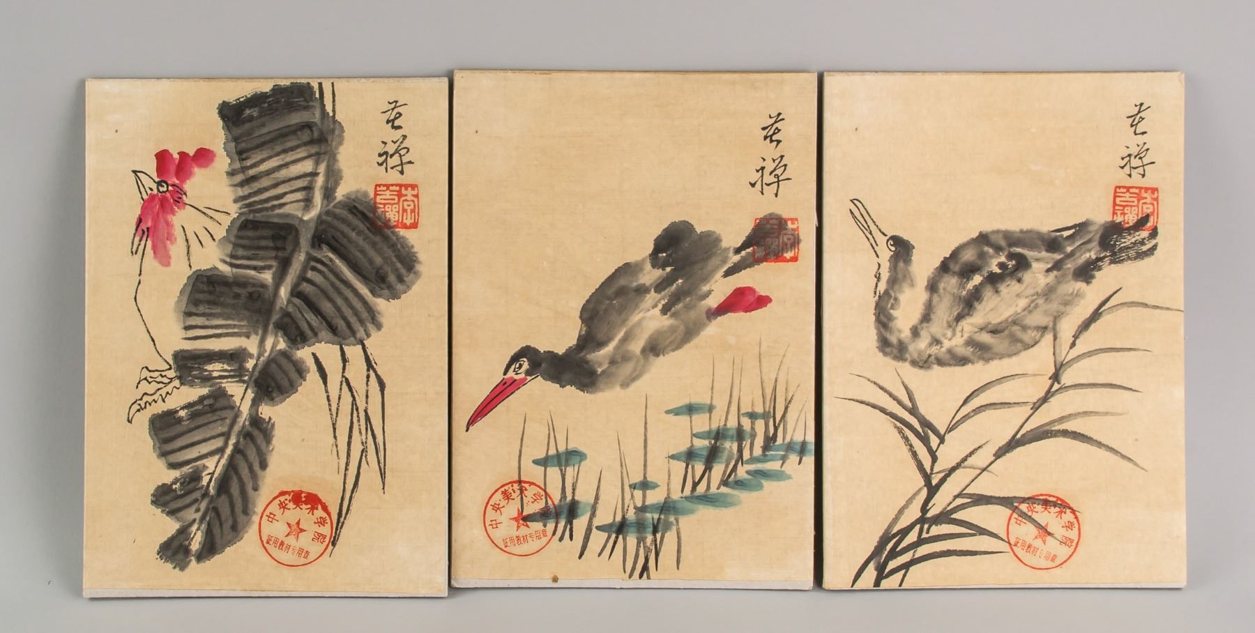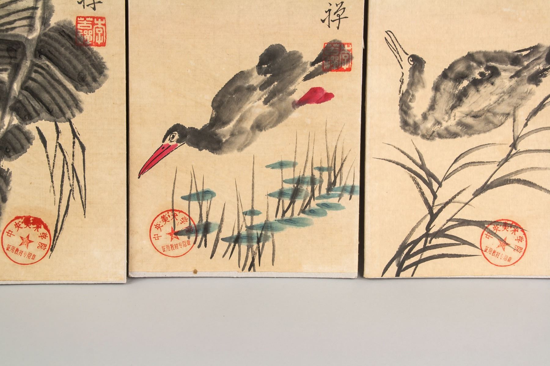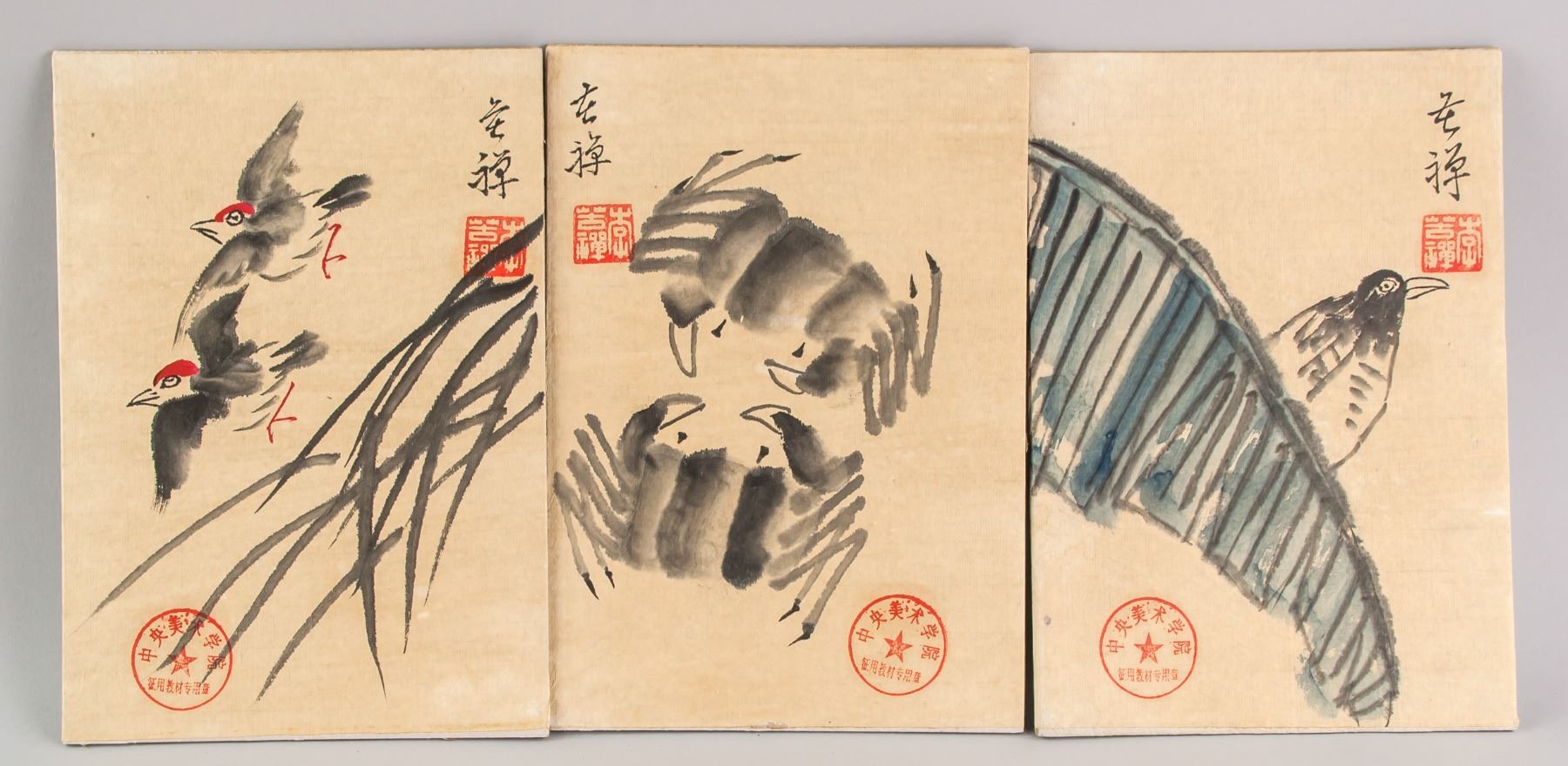 Ink and watercolor on paper. Featuring a set of 6 paintings of birds, crabs, rooster and a little egret. Signed Li Kuchan 1899-1983 Chinese, each one inscribed with 1 artist seal and teaching material stamp of Chinese Academy of Fine Arts. 27 x 19 cm (each).