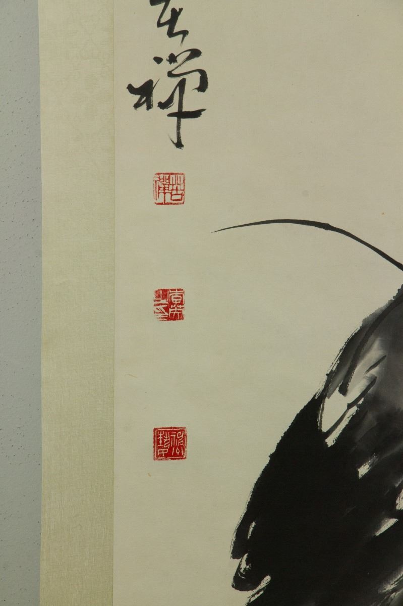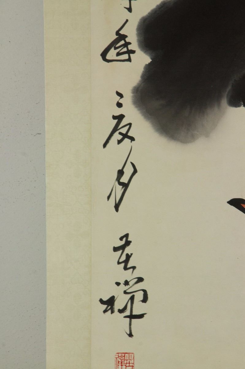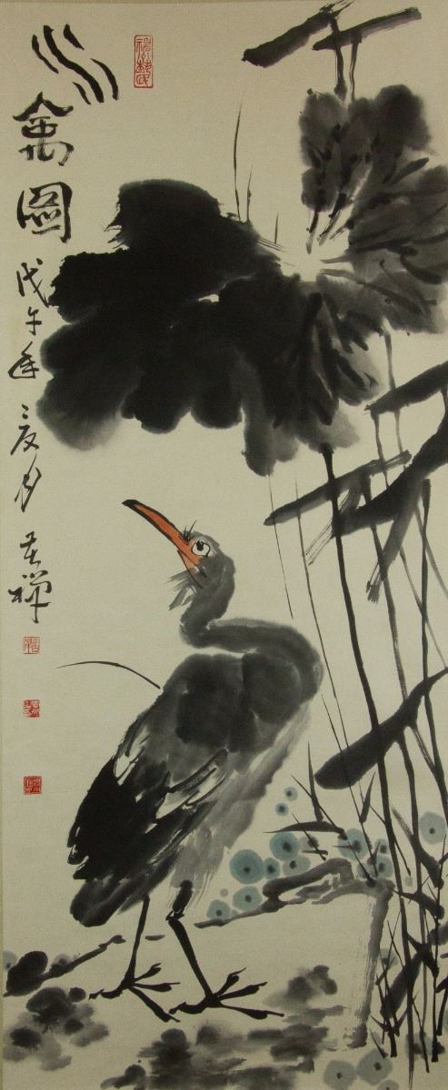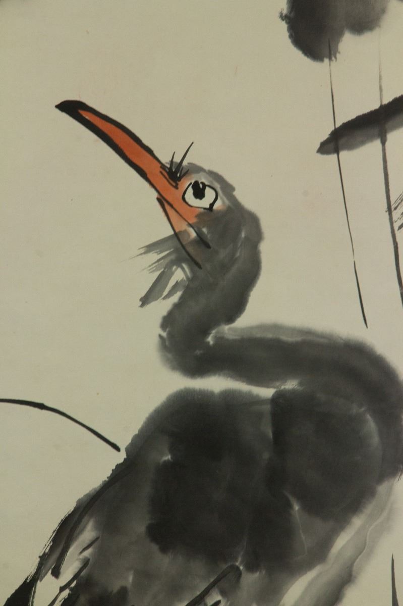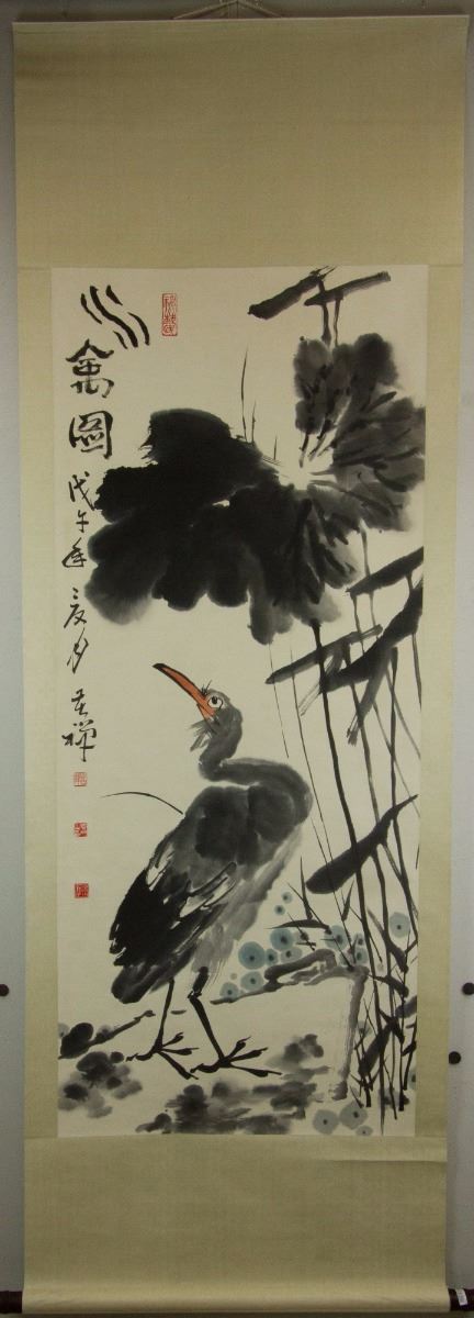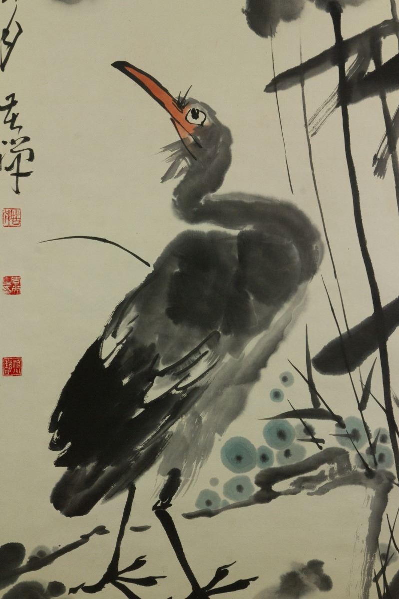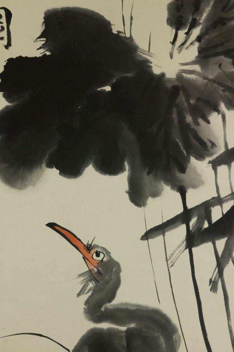 Little egret under lotus; Chinese ink and watercolour on paper; hanging scroll; signed Li Kuchan (1899-1983); inscribed with 4 artist seals; 135 cm × 57 cm