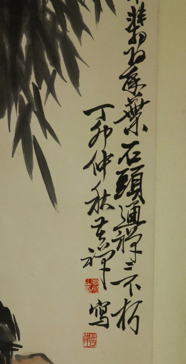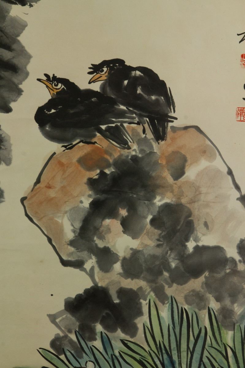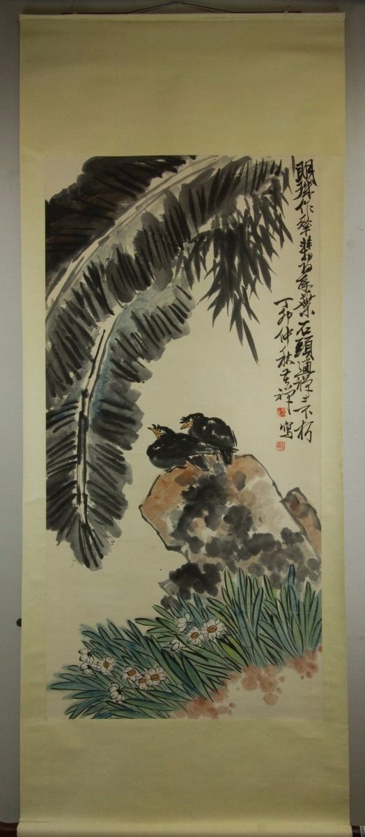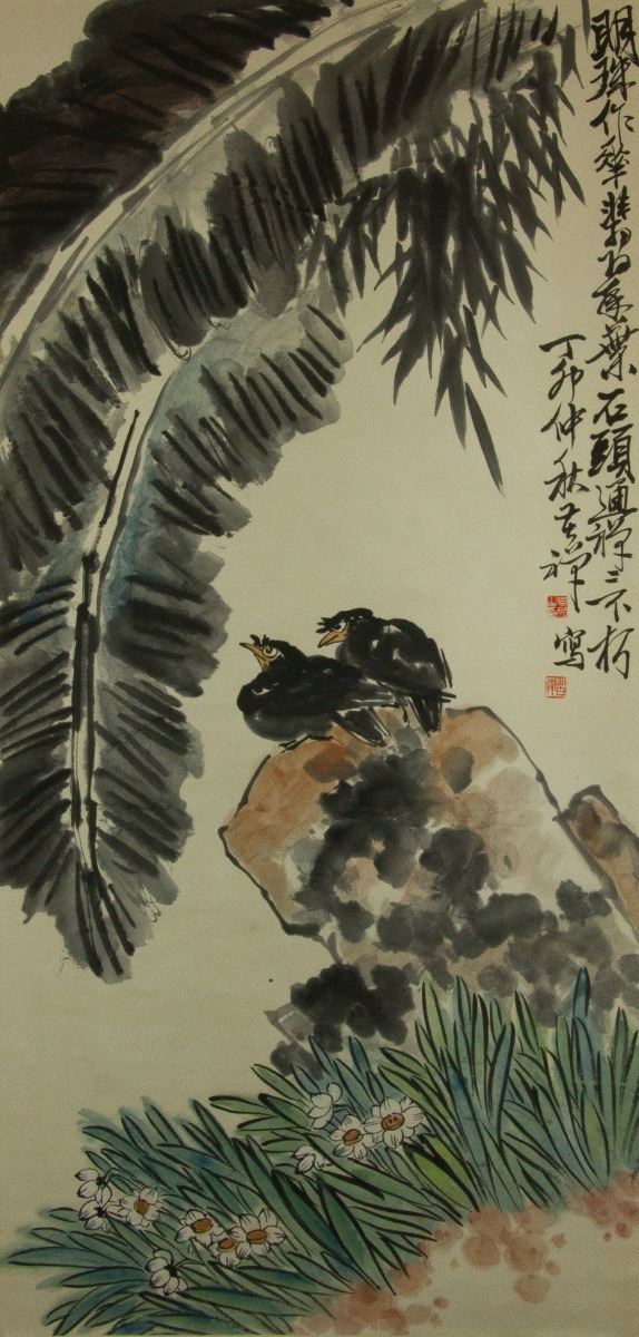 Two crows standing on craggy rock under musaceae tree; Chinese ink and watercolour on paper; hanging scroll; signed Li Kuchan (1899-1983); inscribed with 2 artist seals; 135 cm × 67 cm