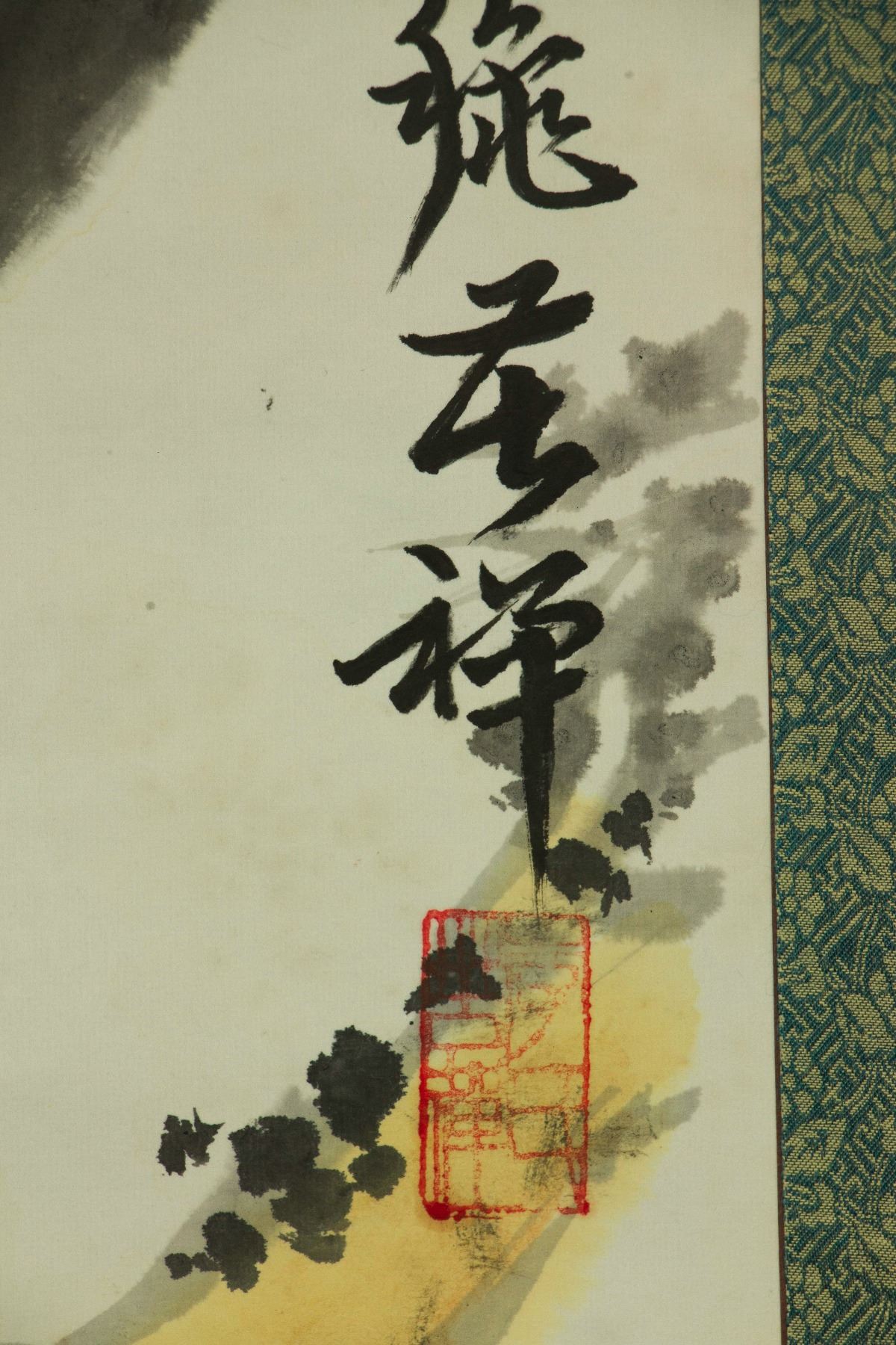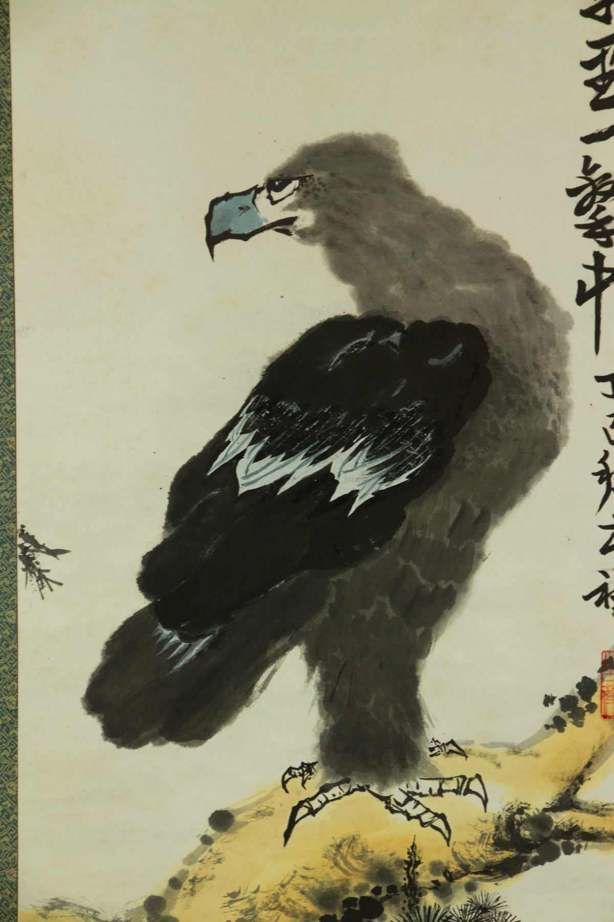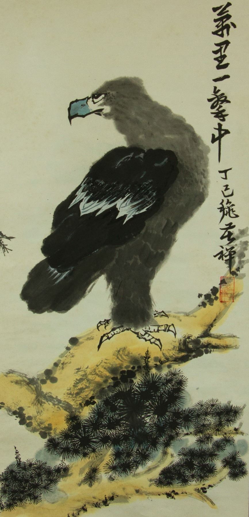 Eagle standing on pine tree branch; Chinese ink and watercolour on paper; hanging scroll; signed Li Kuchan and inscribed with one artist seal; 140 cm × 58 cm