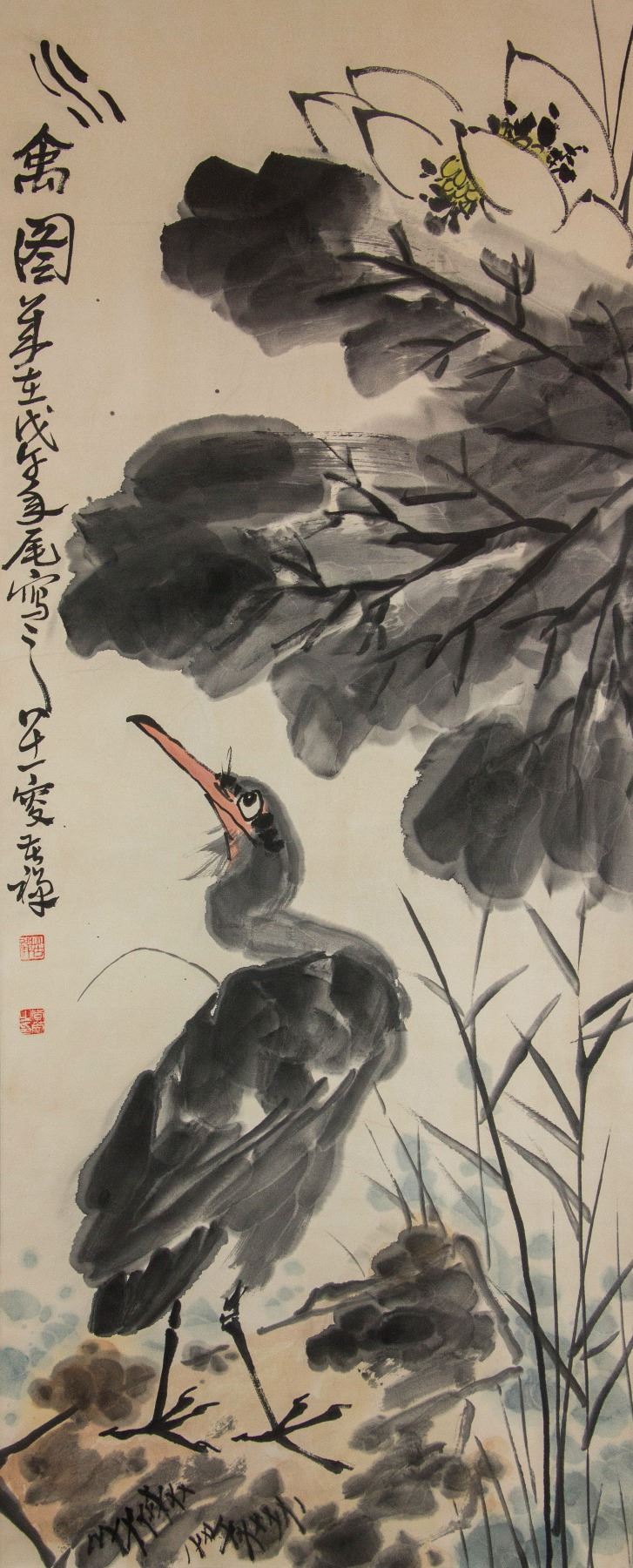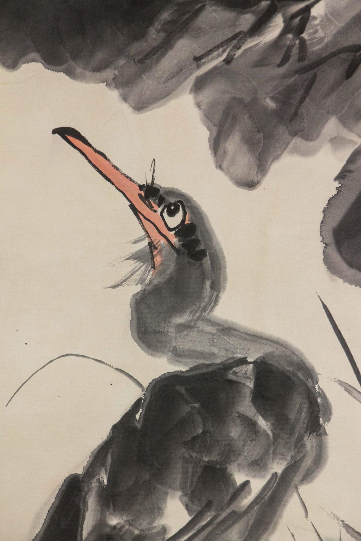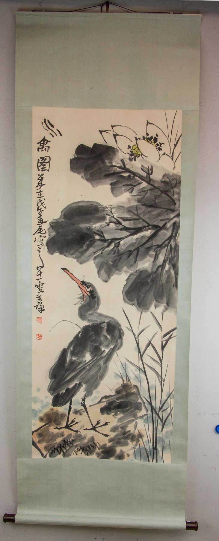 Painting of little egret and lotus flower; Chinese ink and watercolour on paper; hanging scroll; signed Li Kuchan (1899-1983); inscribed with 2 artist seals; 138 cm x 55 cm