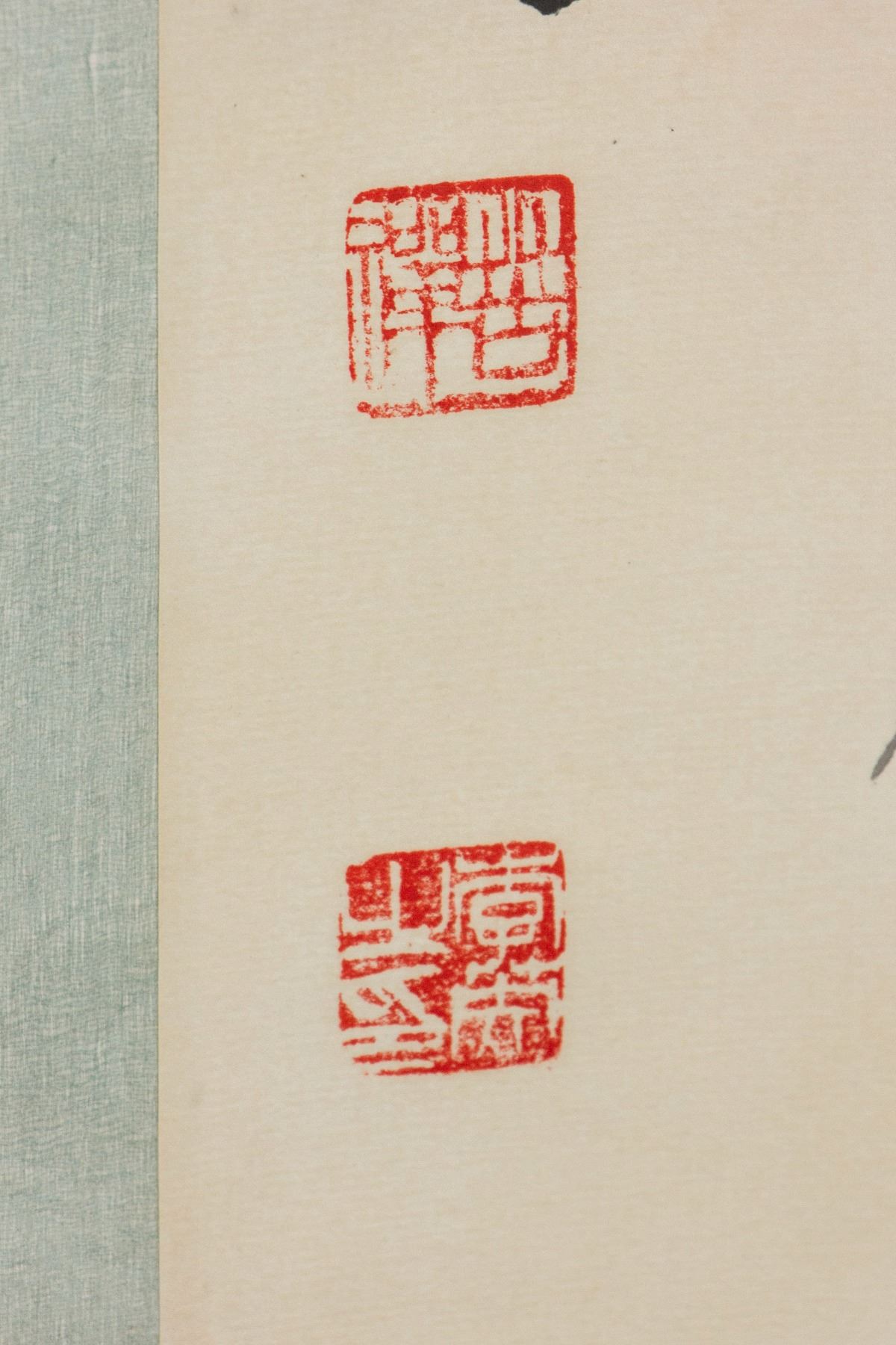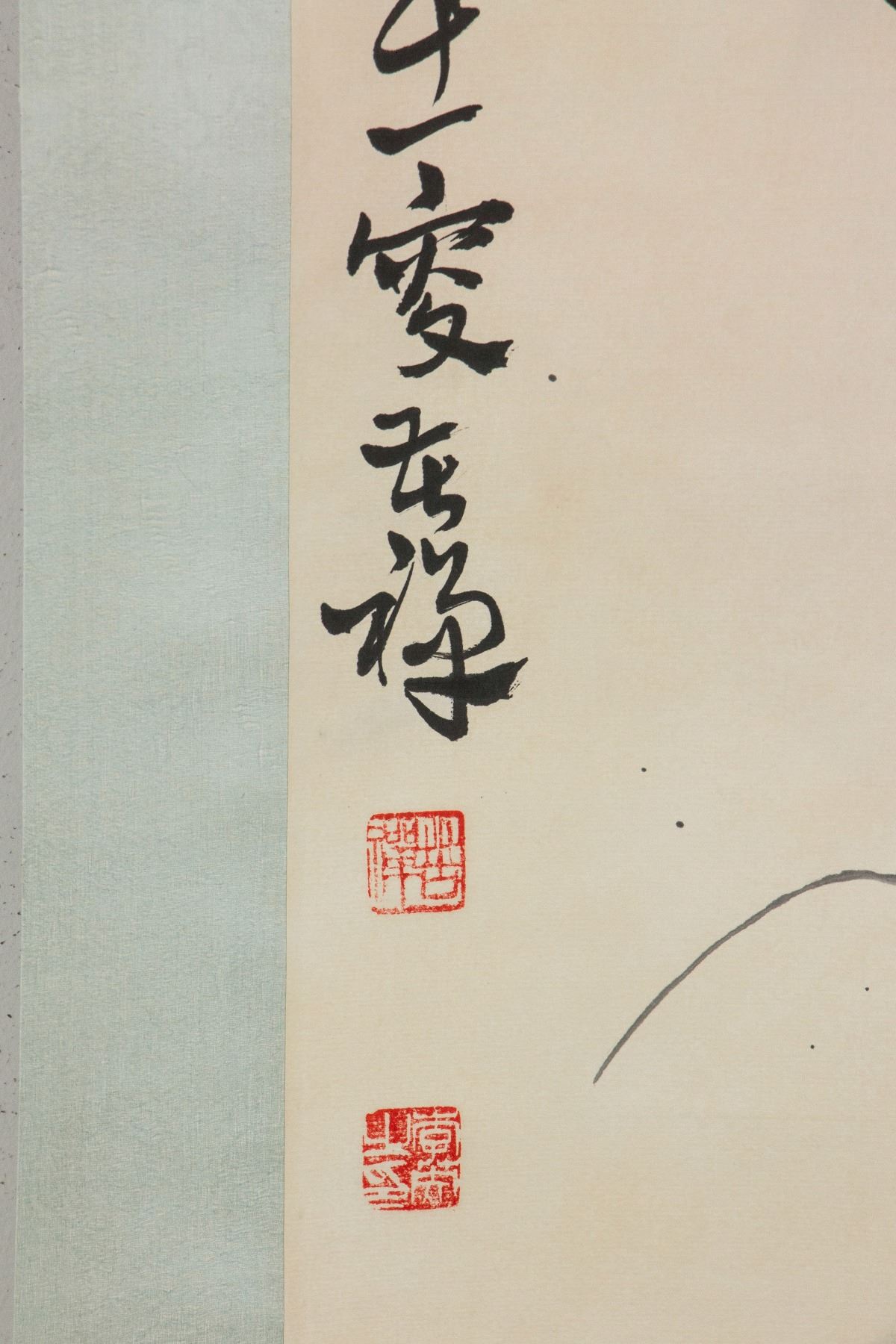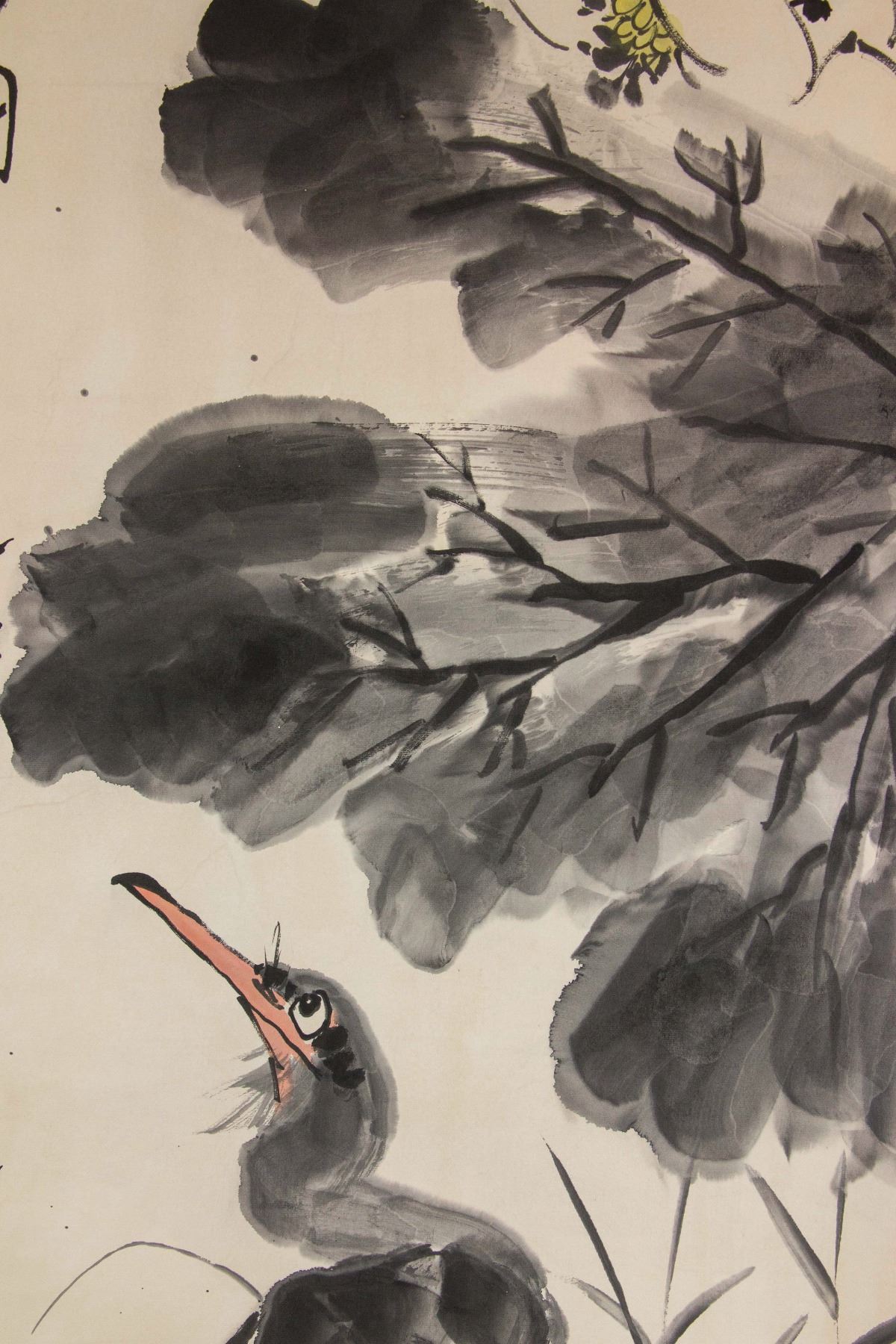 Painting of little egret and lotus flower; Chinese ink and watercolour on paper; hanging scroll; signed Li Kuchan (1899-1983); inscribed with 2 artist seals; 138 cm x 55 cm