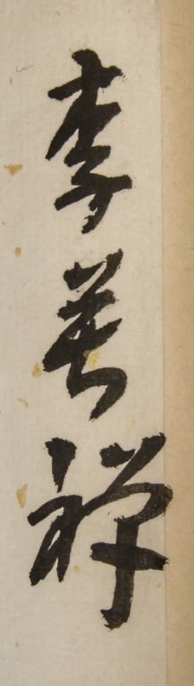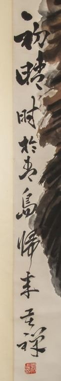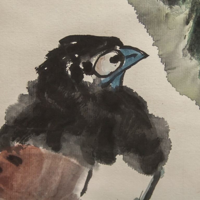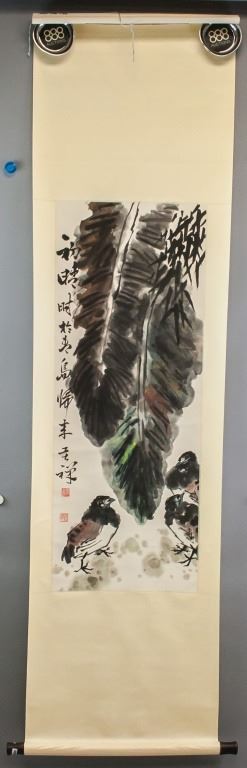 Chinese watercolor on paper. Featuring three birds standing around a large leaf hanging down. Inscribed with two seals, one reading "KU CHAN". 101 x 38.5 cm.