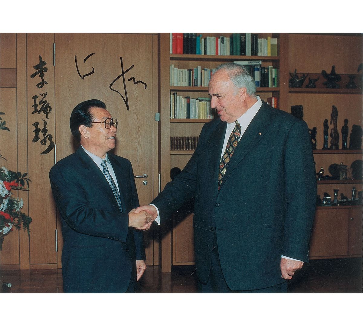 Chinese politician (born 1934) who was a member of the Standing Committee of the Political Bureau of the Communist Party of China from 1992 to 2002. Color glossy 9.5 x 7 photo, signed in Chinese by Li Ruihuan in black ink and by Helmut Kohl in black felt tip. Photo is signed again on the reverse by Li. In fine condition, with slightly irregular ink adhesion to signature on reverse.