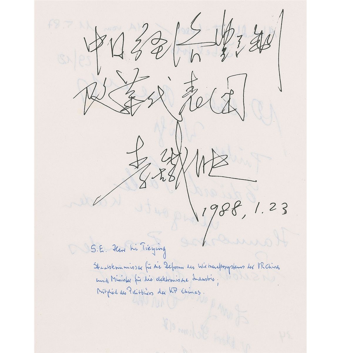 Chinese politician and author (born 1936) who served as vice chairman of the Standing Committee of the National People's Congress and president of the Chinese Academy of Social Sciences. Ink signature in Chinese on an off-white 6.25 x 8.25 sheet; Li adds the date of January 23, 1988. Signed by nine others on the reverse. In fine condition.