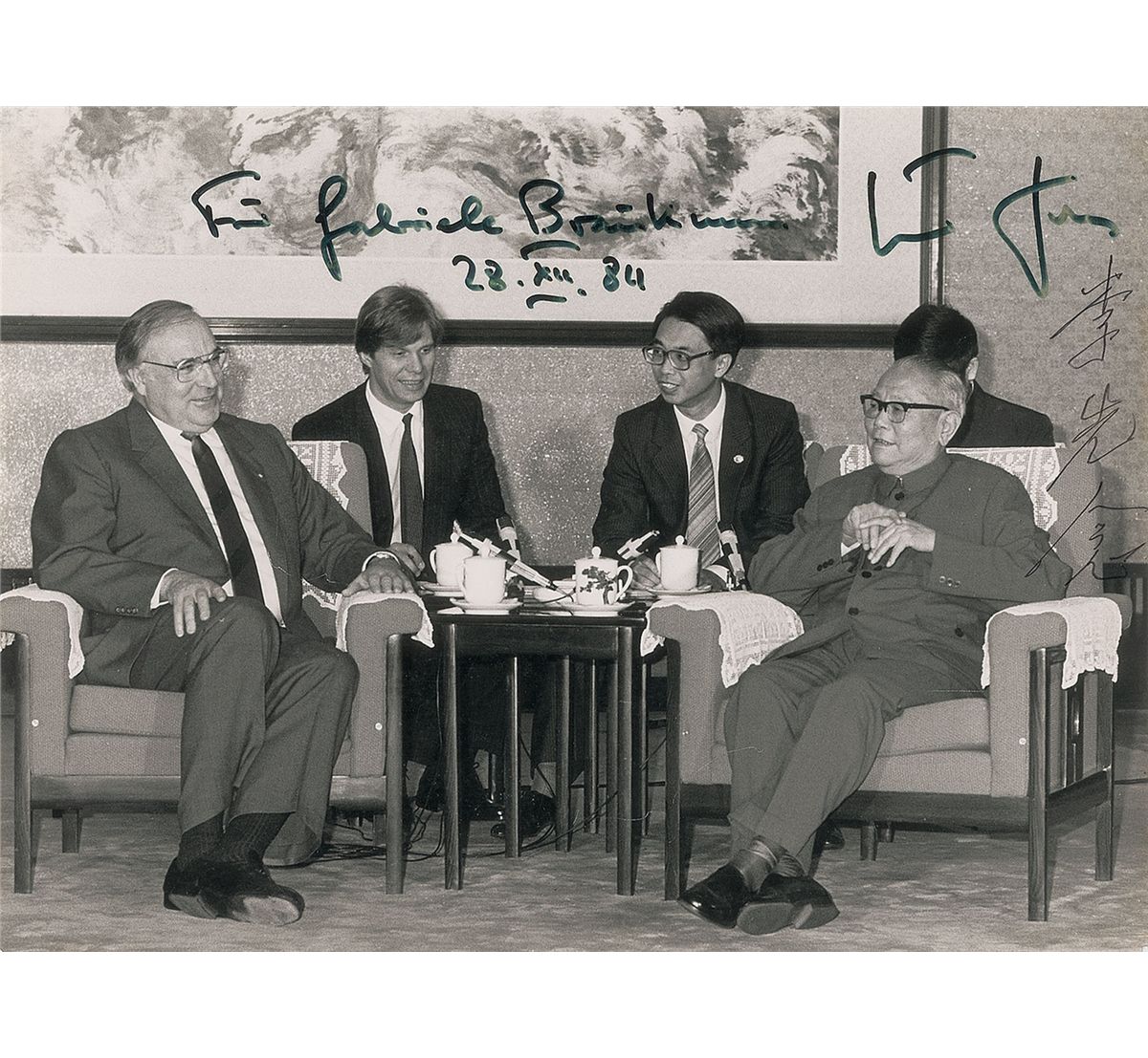 Third president of the People’s Republic of China (1909–1992) who served from 1983 to 1988; considered one of the Eight Elders of the Communist Party of China. Rare glossy 9.5 x 7 photo of Li Xiannian, Helmut Kohl, and two others conversing over tea, signed in black ink by Li Xiannian in Chinese, and inscribed in black felt tip by Kohl to a German politician, dated December 28, 1984. In fine condition, with light fading to Kohl’s last name. Kohl, his wife, and the Federal Minister of Economic Cooperation, Dr. Jurgen Warnke, paid an official visit to the People’s Republic of China from October 6 to 13, 1984. This photo of Kohl’s meeting with President Li Xiannian was taken at the Large Hall of the People in Peking on October 9, 1984, a few days into the German chancellor’s visit.