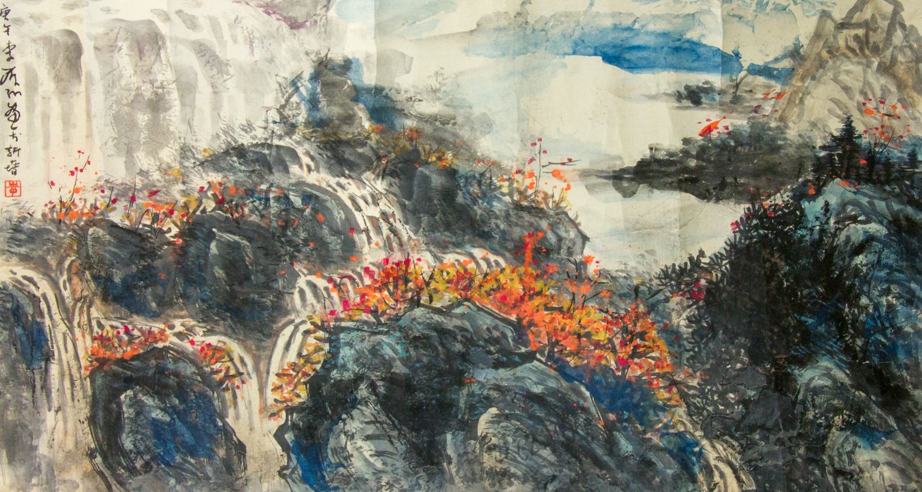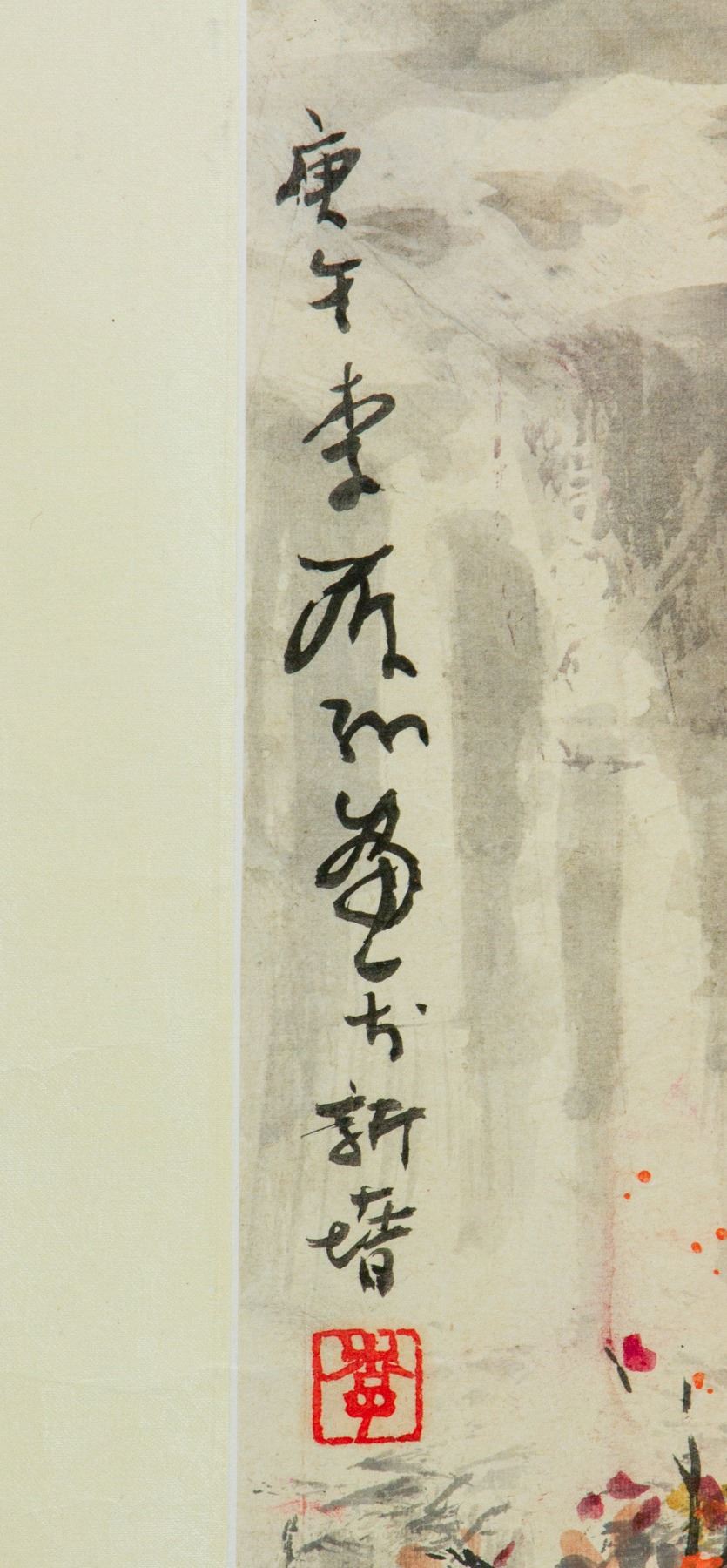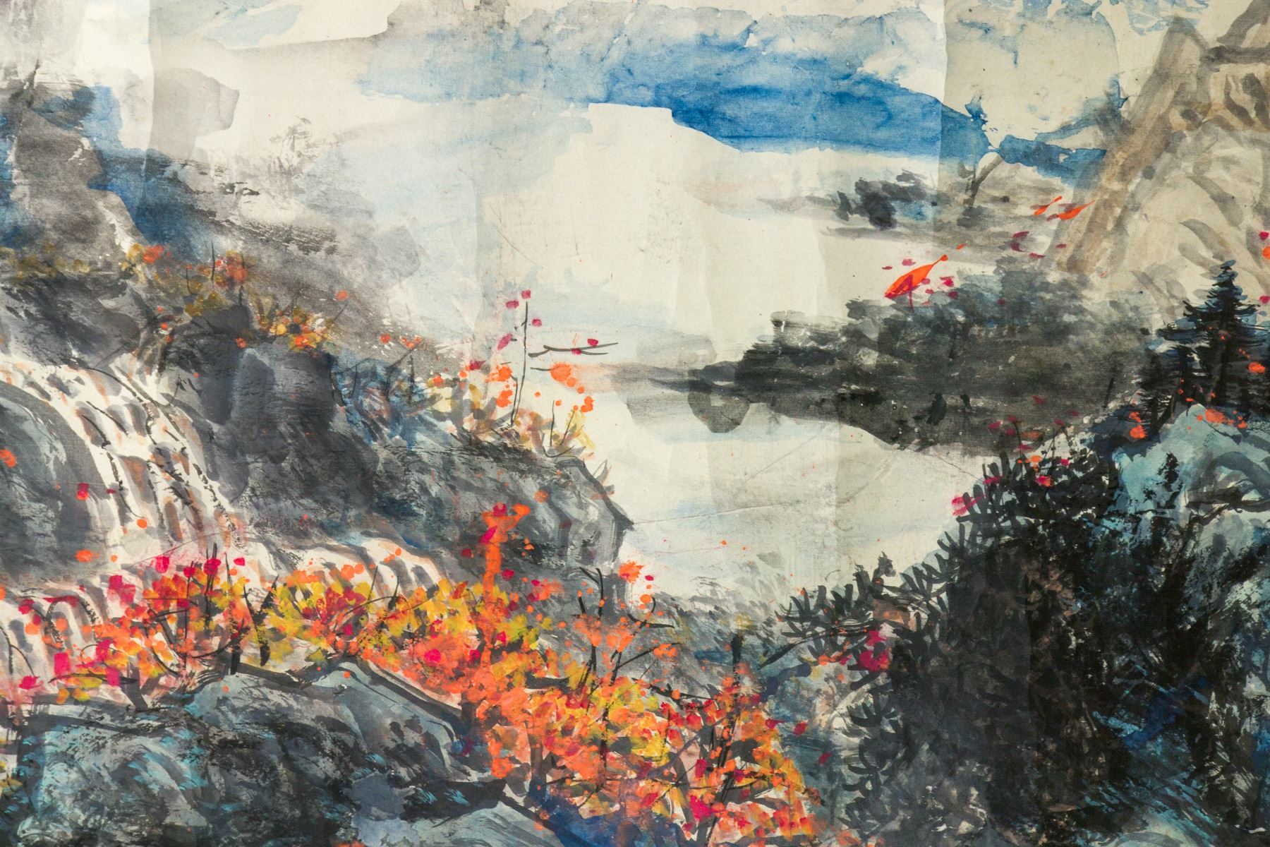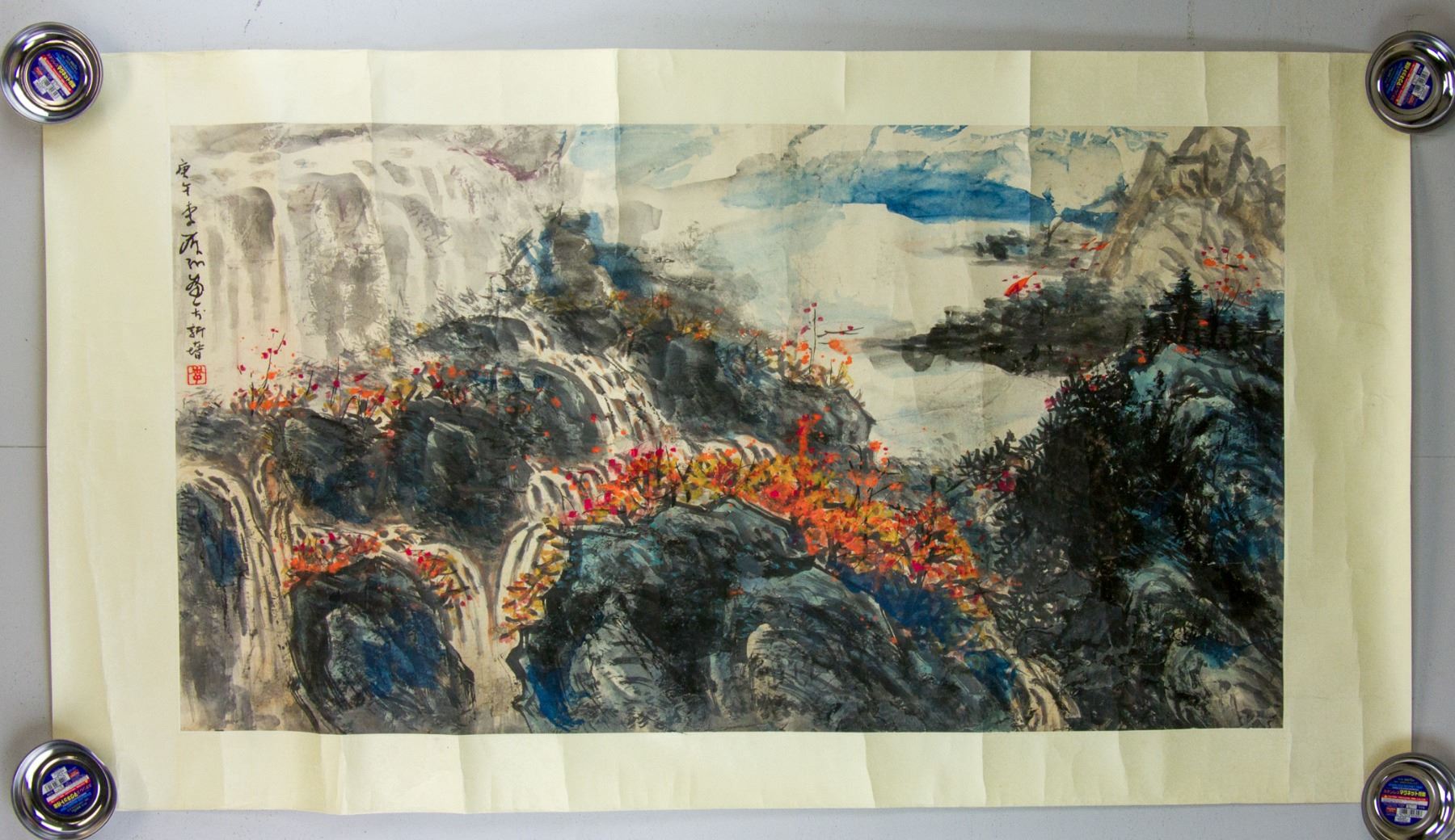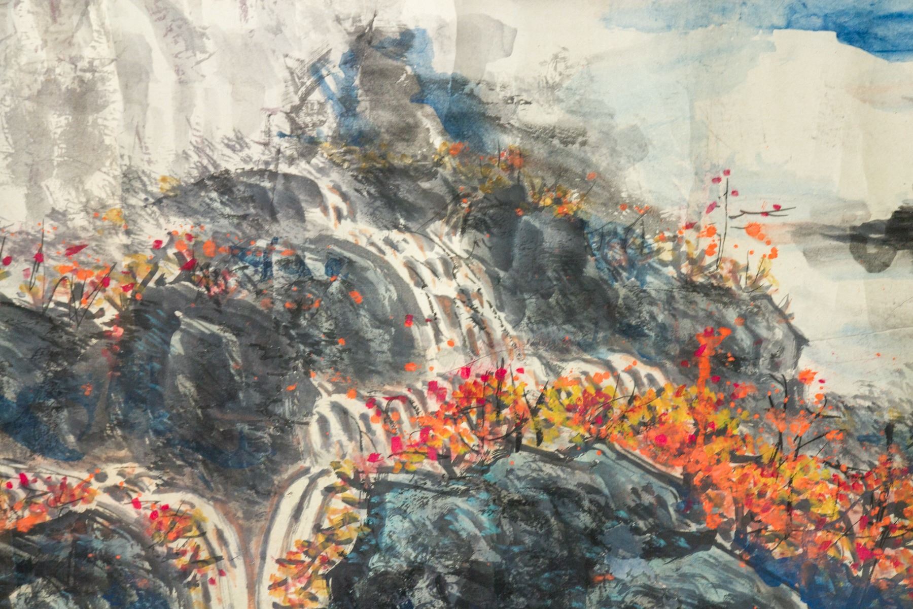 Ink and watercolor on paper roll. Featuring mountainous landscape in autumn. Signed Li Xinchun 20th century Chinese, inscribed with 1 artist seal. 118 x 64 cm