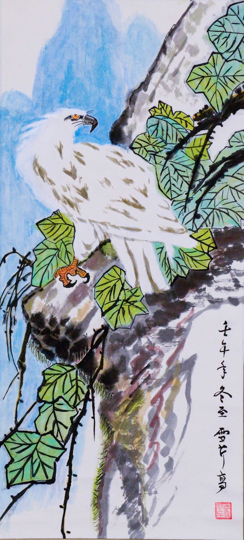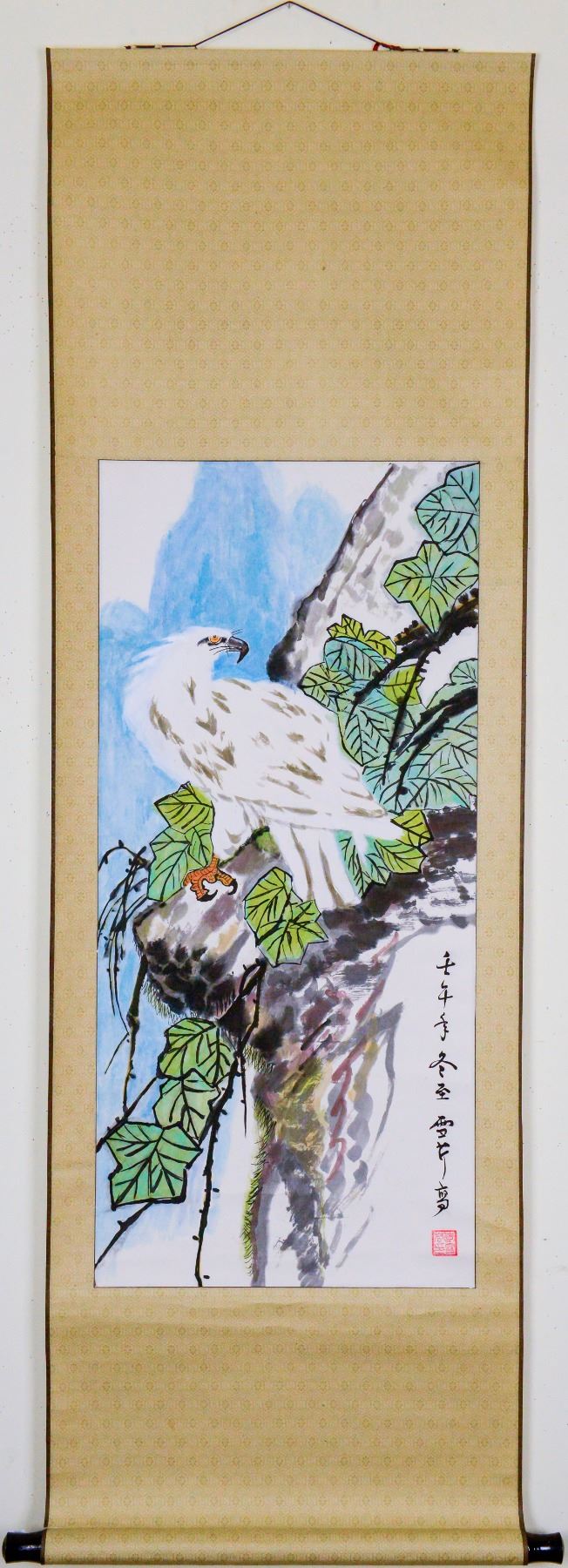 Ink and watercolor on paper, hanging scroll, featuring an eagle, signed Li Xueqin (20th century, Chinese), inscribed with one artist seals 168 x 55 cm.