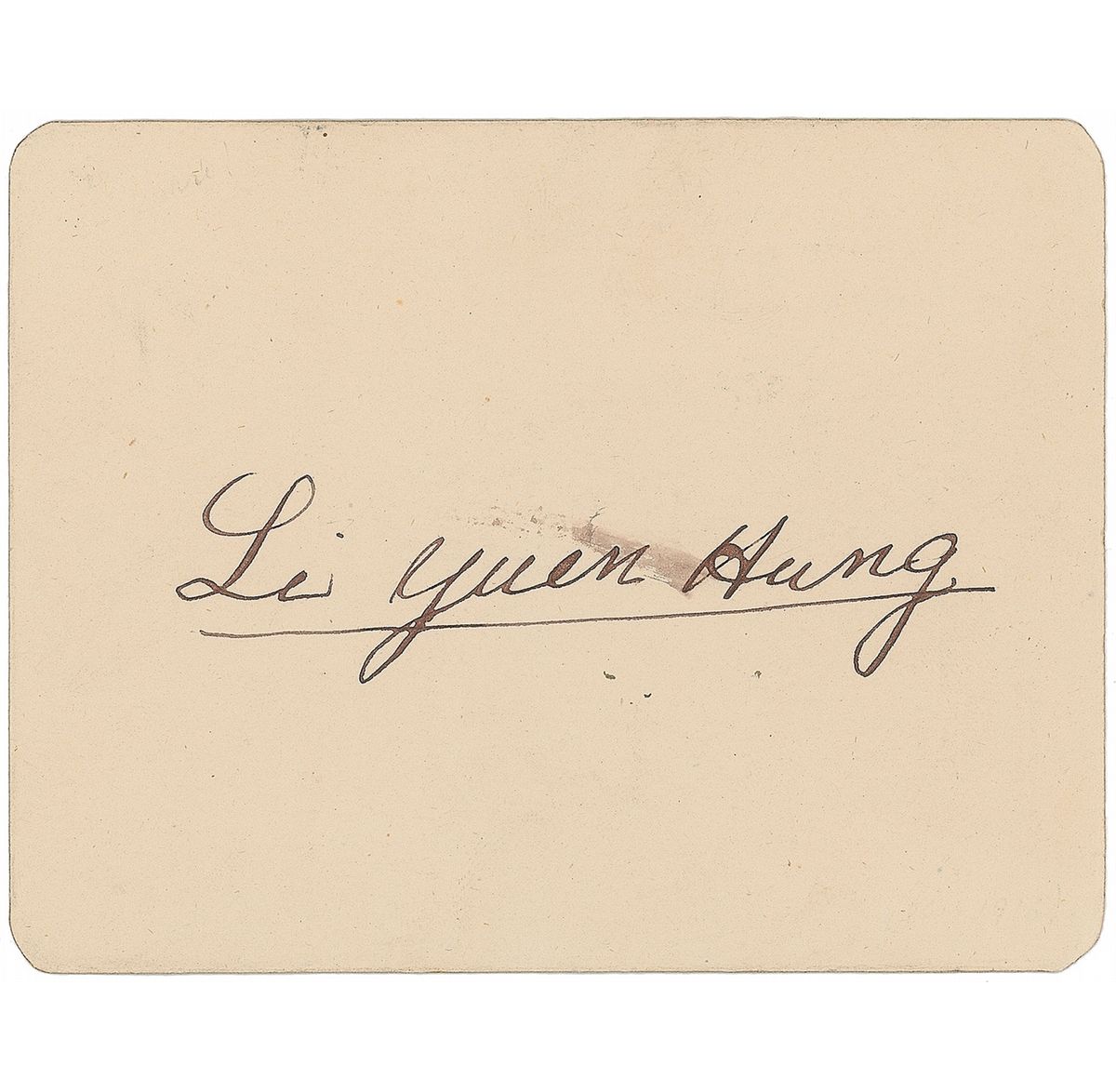 President of the Republic of China (1864–1928) who served in office on three different occasions, with his last presidency occurring from 1922 to 1923; a notable Chinese general and political figure during the Qing dynasty and the republican era. Fountain pen signature, “Li Yuen Hung,” on an off-white 4.5 x 3.5 card. In fine condition, with a bit of light brushing to ink. An exceptionally bold, clean example of this early Chinese autograph.