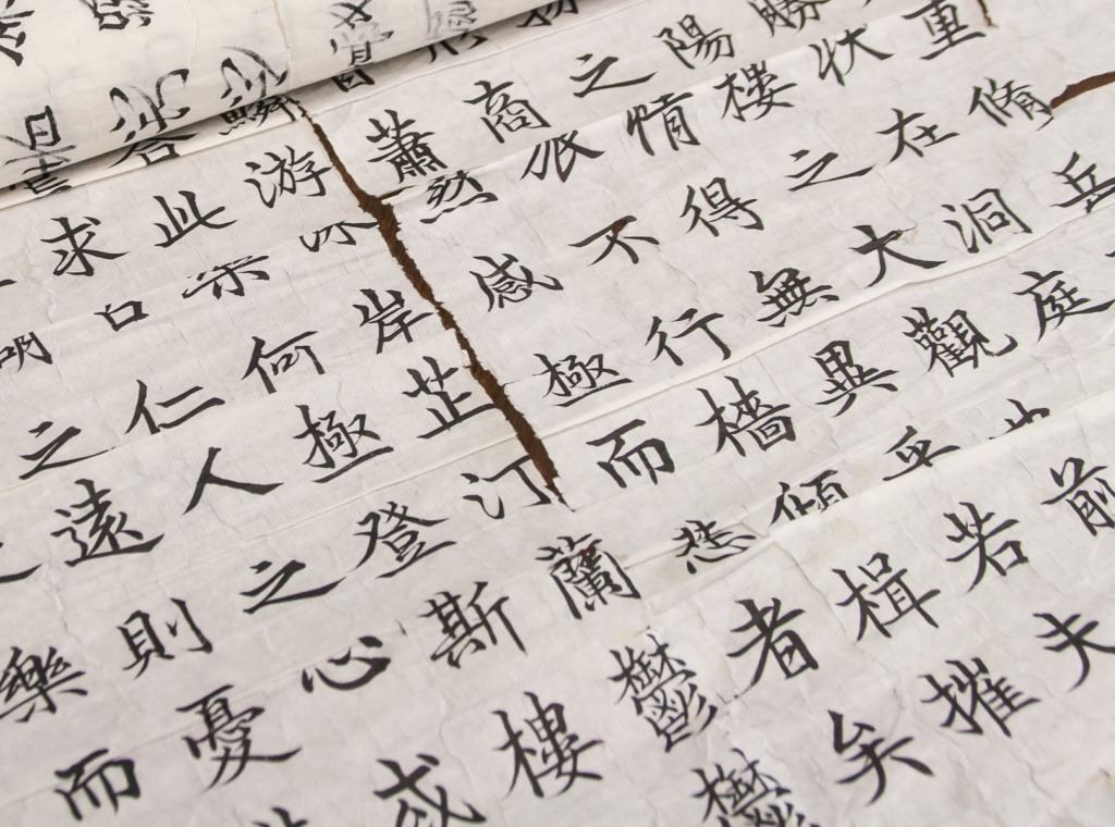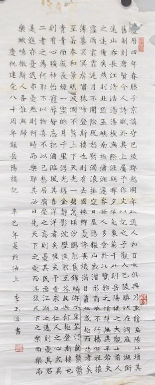 Ink on paper. Featuring Chinese calligraphy in regular script. Signed "Li Yuhai" in Chinese characters to the left. Inscribed with three artist seals. In damaged condition. 95 x 38 cm.