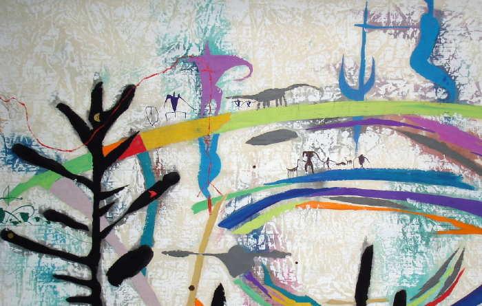 Marvelous and very representative example of this avidly collected artist who left the Yunnan School for the more romantic classic style of decorative art. This very contemporary interpretation of petroglyphs found in the Yinshan Mountains of China was created by the well known Chinese painter, Li Zhong-Liang, whose work has been exhibited all over the world and is represented in major museums in China. Paintings are acrylic, gouache & Chinese inks on handmade, double-weight rice paper imported from China in large 40x40 in.format. The detail work is exceptional. Add domestic shipping of $40 or International depending upon location.