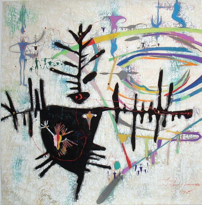 Marvelous and very representative example of this avidly collected artist who left the Yunnan School for the more romantic classic style of decorative art. This very contemporary interpretation of petroglyphs found in the Yinshan Mountains of China was created by the well known Chinese painter, Li Zhong-Liang, whose work has been exhibited all over the world and is represented in major museums in China. Paintings are acrylic, gouache & Chinese inks on handmade, double-weight rice paper imported from China in large 40”x40” format. The detail work is exceptional. Add domestic shipping of $40 or International depending upon location.