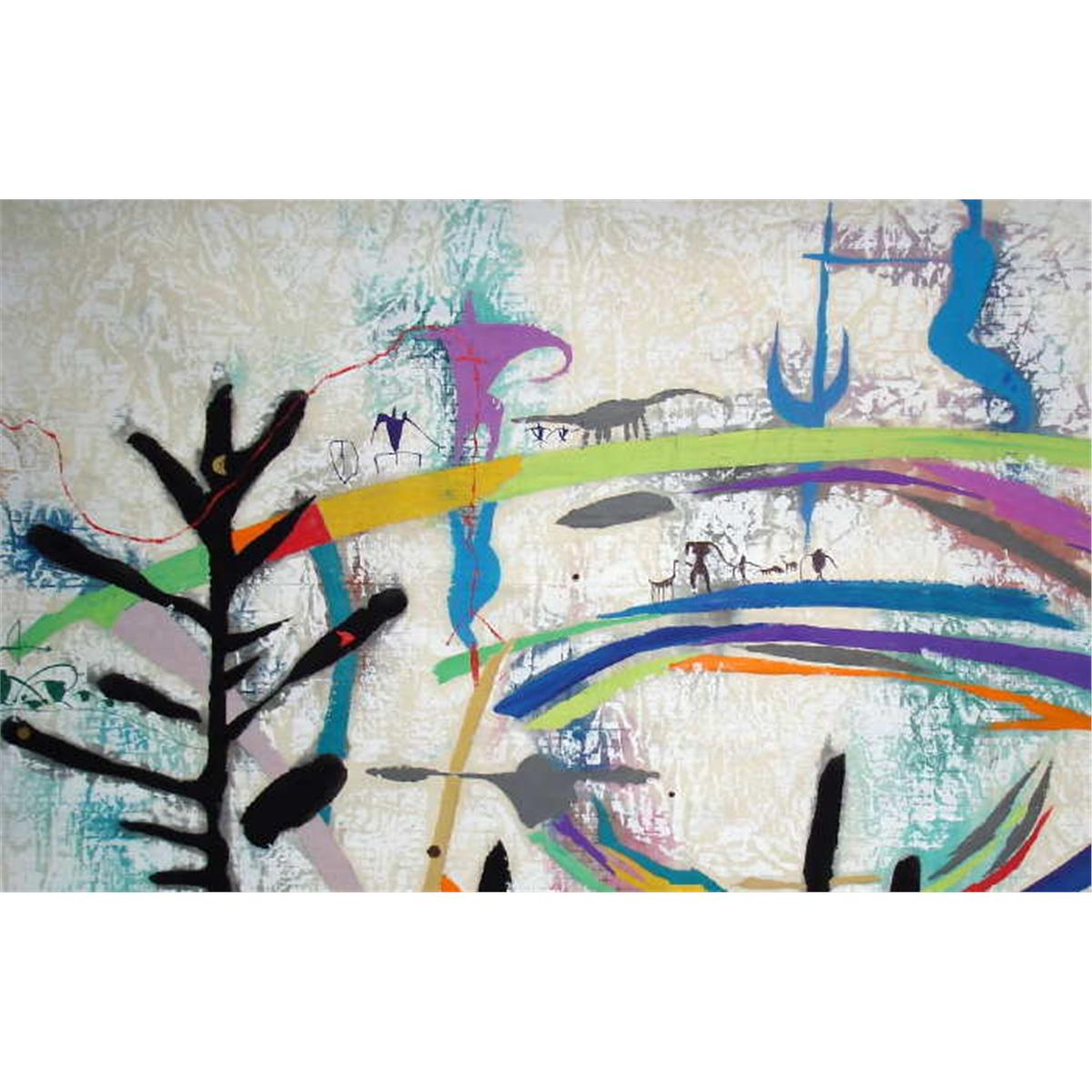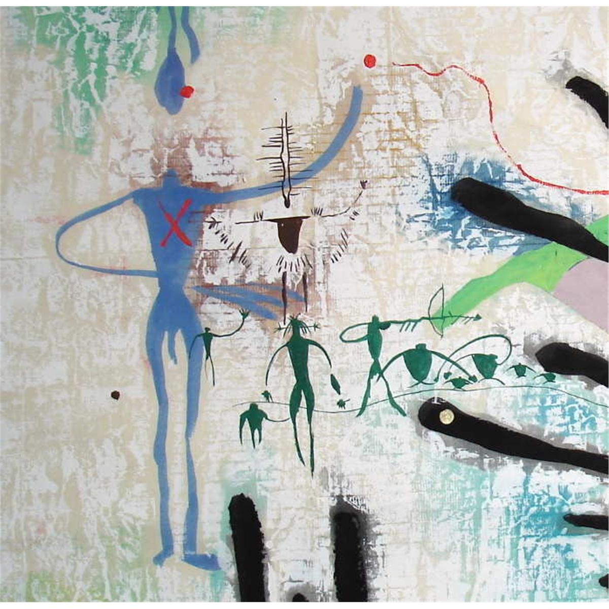 Marvelous and very representative example of this avidly collected artist who left the Yunnan School for the more romantic classic style of decorative art. This very contemporary interpretation of petroglyphs found in the Yinshan Mountains of China was created by the well known Chinese painter, Li Zhong-Liang, whose work has been exhibited all over the world and is represented in major museums in China. Paintings are acrylic, gouache & Chinese inks on handmade, double-weight rice paper imported from China in large 40”x40” format. The detail work is exceptional. Add domestic shipping of $40 or International depending upon location.