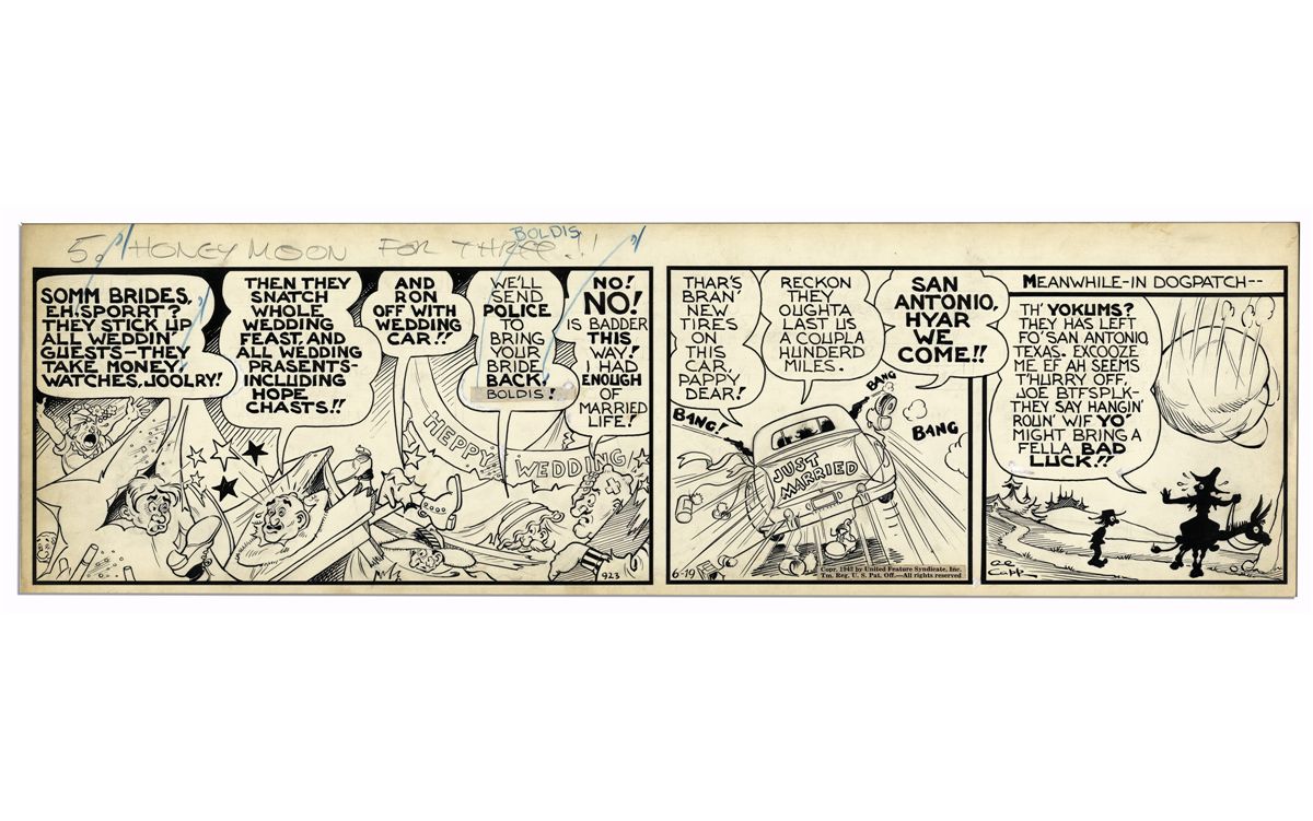 ''Li'l Abner'' Comic Strip Drawn & Signed by Capp From 19 June 1942 -- Joe Btfsplk & Aftermath of Scraggs Posing as Mail Order Brides -- 22.75'' x 6.75'' -- Toning, & Blue Pencil, Near Fine
