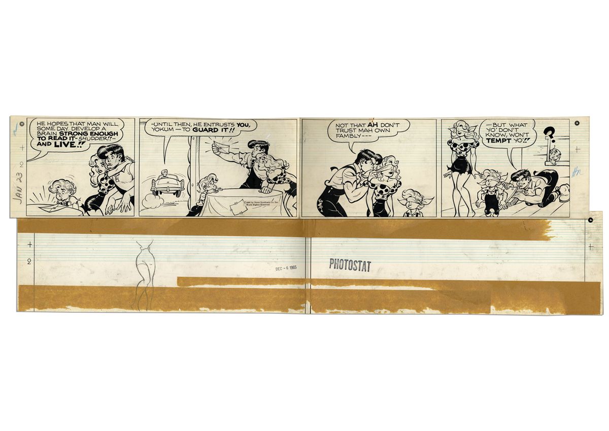 ''Li'l Abner'' Comic Strip From 23 January 1966 -- Hand-Drawn & Signed by Al Capp Featuring Li'l Abner, Daisy Mae & Honest Abe -- 2 Sheets, 14.5'' x 5'' Each -- Toning & White Out, Near Fine