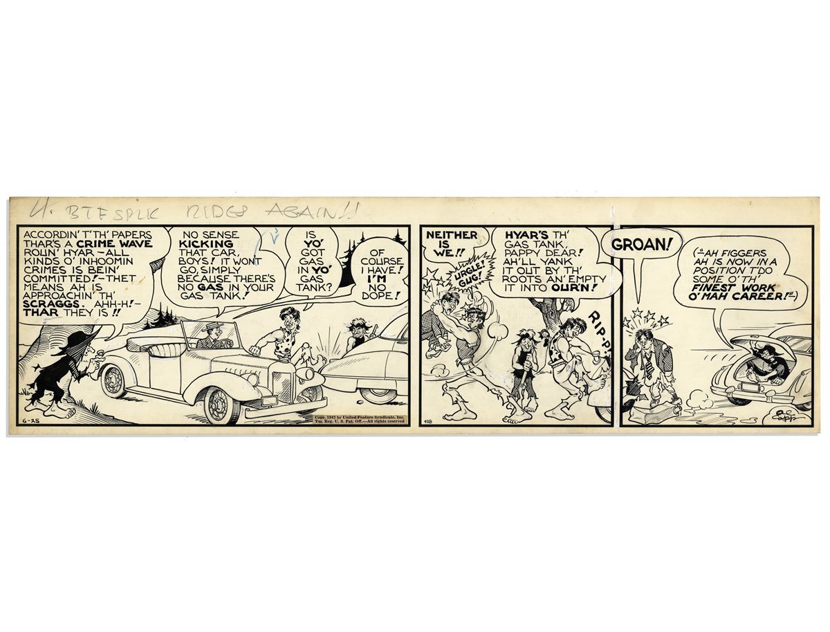 ''Li'l Abner'' Comic Strip From 25 June 1942 -- Hand-Drawn & Signed by Al Capp -- Featuring Joe Btfsplk & The Scraggs -- 22.75'' x 7'' -- Toning, White Out & Soiling, Else Near Fine