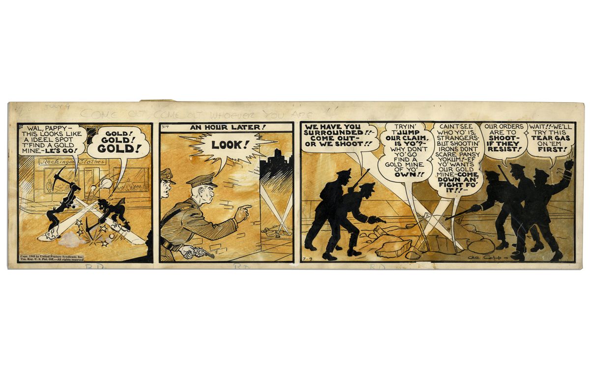 ''Li'l Abner'' Comic Strip From 9 July 1940 Featuring Mammy & Pappy Digging Gold in Los Angeles -- Hand-Drawn & Signed by Al Capp -- 23'' x 6.75'' -- Color Added, Else Near Fine