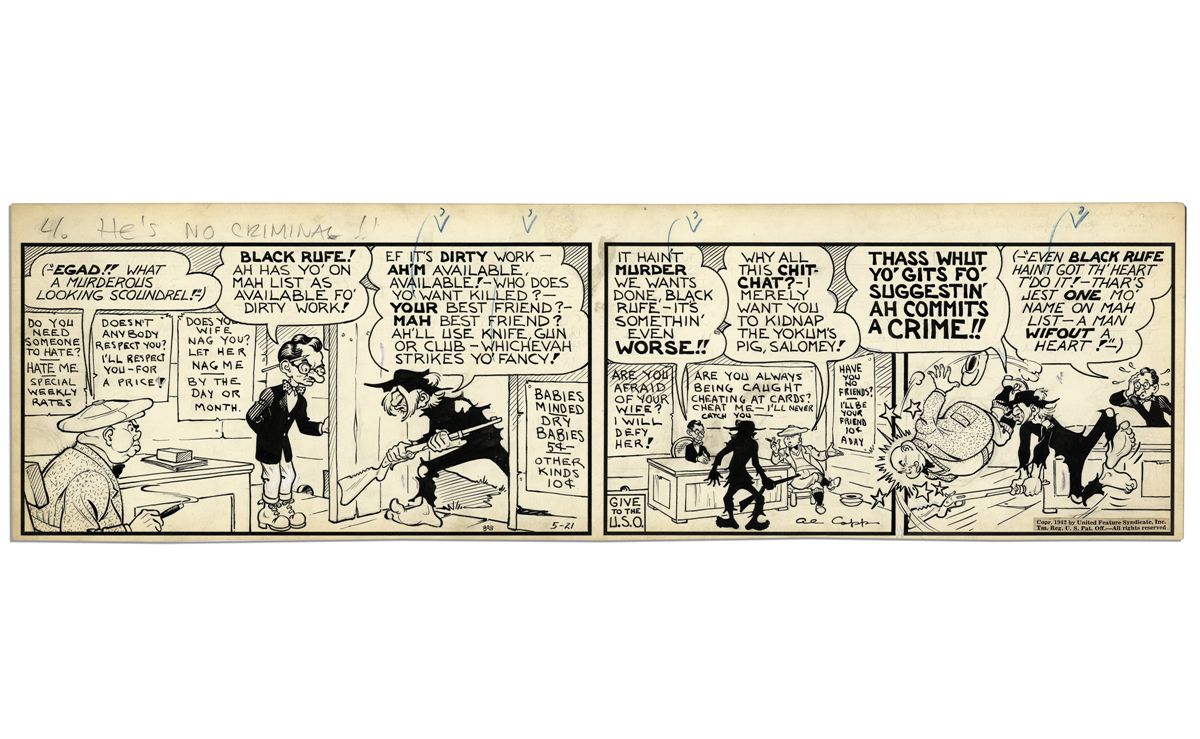 ''Li'l Abner'' Comic Strip Hand-Drawn & Signed by Al Capp  From 21 May 1942 -- Featuring Available Jones & Black Rufe -- 22.75'' x 7'' -- Toning & White Out, Near Fine