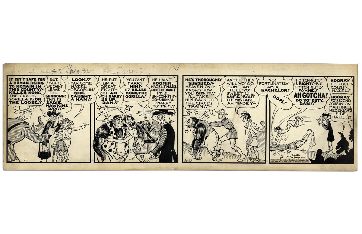 ''Li'l Abner'' Comic Strip Hand-Drawn & Signed by Al Capp -- From Sadie Hawkins Day, 23 November 1940 -- Featuring Hazel Hobgoblin -- 23'' x 7'' -- Toning & White Out, Near Fine