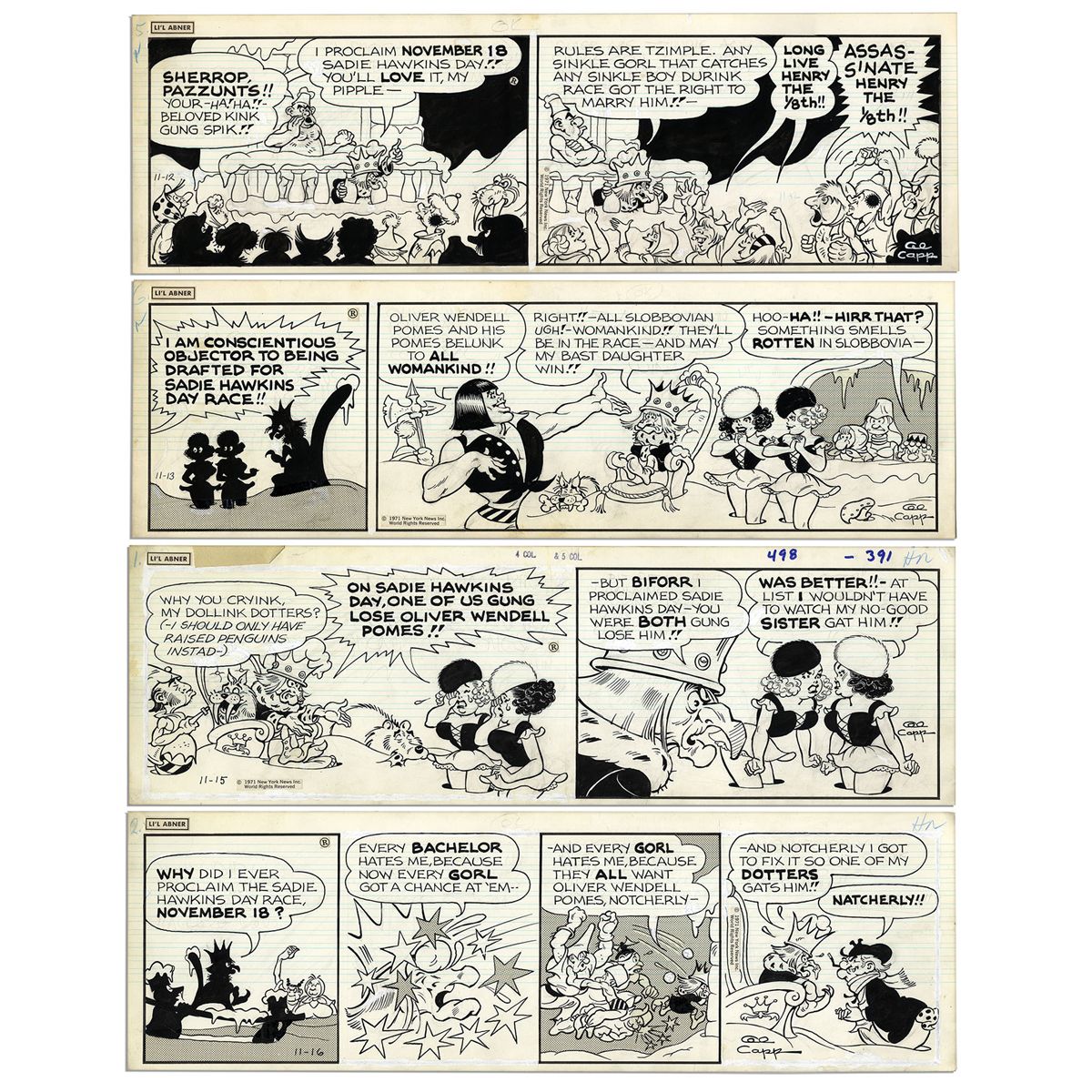 ''Li'l Abner'' Lot of 4 Strips, Each Drawn & Signed by Al Capp From 1971 -- Sadie Hawkins Day in Slobbovia, With ''King Henry The 1/8th'' & Oliver Wendell Pomes -- 19.75'' x 6.25'' -- Near Fine